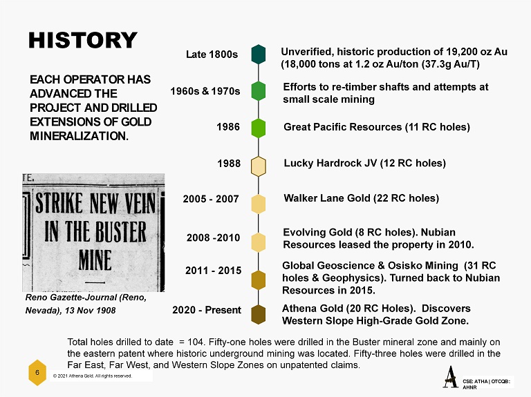 © 2021 Athena Gold. All rights reserved. CSE: ATHA | OTCQB : AHNR 6 EACH OPERATOR HAS ADVANCED THE PROJECT AND DRILLED EXTENSIONS OF GOLD MINERALIZATION . Unverified, historic production of 19,200 oz Au (18,000 tons at 1.2 oz Au/ton (37.3g Au/T) Efforts to re - timber shafts and attempts at small scale mining Great Pacific Resources (11 RC holes) Lucky Hardrock JV (12 RC holes) Walker Lane Gold (22 RC holes) Evolving Gold (8 RC holes). Nubian Resources leased the property in 2010. Global Geoscience & Osisko Mining (31 RC holes & Geophysics). Turned back to Nubian Resources in 2015. Late 1800s 1960s & 1970s 1986 1988 2005 - 2007 2008 - 2010 2011 - 2015 HISTORY Athena Gold (20 RC Holes). Discovers Western Slope High - Grade Gold Zone. 2020 - Present Reno Gazette - Journal (Reno, Nevada), 13 Nov 1908 Total holes drilled to date = 104. Fifty - one holes were drilled in the Buster mineral zone and mainly on the eastern patent where historic underground mining was located. Fifty - three holes were drilled in the Far East, Far West, and Western Slope Zones on unpatented claims.