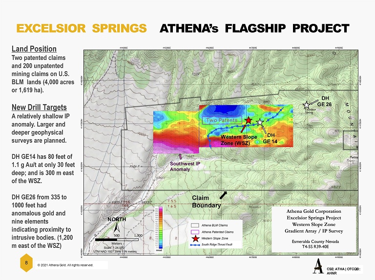 7 OTCQB : AHNR CSE: ATHA | OTCQB : AHNR © 2021 Athena Gold. All rights reserved. 7 SIGNIFICANT GRADES AND THICKNESSES IN HISTORIC DRILL HOLES The Excelsior Springs Project was acquired based on these significant thick, high - grades at shallow - depths; strong exploration potential; and a data base including 84 RC holes drilled from 1986 through 2015. Most of the old holes were angled toward the north. Athena is having better success drilling angled holes toward the south. Hole Interval Gold Depth Meters No. Meters G/T From To TA-03 16.8 1.34 1.5 18.3 TA-11 15.2 1.52 0 15.2 88-02 6.1 3.69 10.7 16.8 88-06 27.4 2.49 0 27.4 88-08 38.1 0.93 0 38.1 EX-02 33.5 2.73 70.1 103.6 EX-13 15.2 2.48 0 15.2 EX-15 30.5 0.87 19.8 50.3 EX-18 6.1 5.44 42.7 48.8 EX-30 17.2 2.38 71.6 94.5 GE-08 22.9 3.3 93 105.2 GE-14 24.4 1.09 9.1 33.5 * Highest Au G/T x Feet product of 300 in the 84 old holes. *