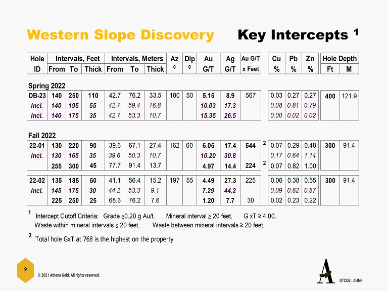 © 2021 Athena Gold. All rights reserved. CSE: ATHA | OTCQB : AHNR 8 Land Position Two patented claims and 200 unpatented mining claims on U.S. BLM lands (4,000 acres or 1,619 ha). New Drill Targets A relatively shallow IP anomaly. Larger and deeper geophysical surveys are planned. DH GE14 has 80 feet of 1.1 g Au/t at only 30 feet deep; and is 300 m east of the WSZ. DH GE26 from 335 to 1000 feet had anomalous gold and nine elements indicating proximity to intrusive bodies. (1,200 m east of the WSZ) EXCELSIOR SPRINGS ATHENA’s FLAGSHIP PROJECT Southwest IP Anomaly Two Patents Western Slope Zone (WSZ) Claim Boundary DH GE 14 DH GE 26 South Ridge Thrust Fault NORTH