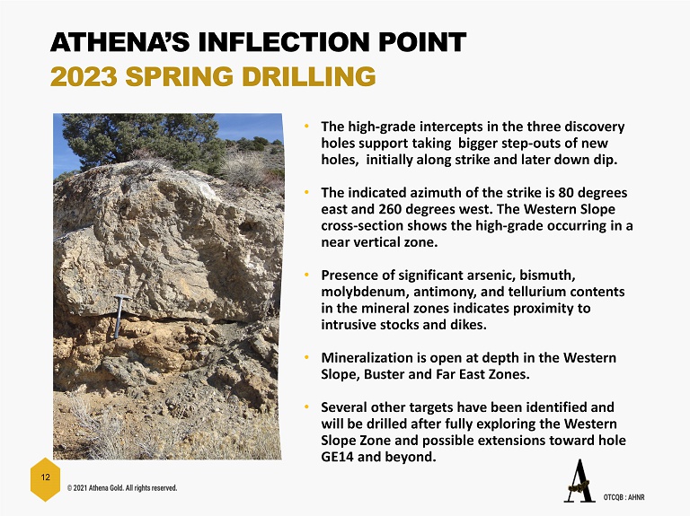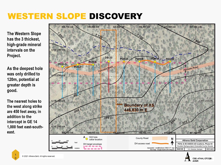 © 2021 Athena Gold. All rights reserved. CSE: ATHA | OTCQB : AHNR 1 0 WESTERN SLOPE DISCOVERY The Western Slope has the 3 thickest, high - grade mineral intervals on the Project. As the deepest hole was only drilled to 120m, potential at greater depth is good. The nearest holes to the west along strike are 450 feet away, in addition to the intercept in GE 14 1,000 feet east - south - east. Buster Zone Boundary of XS Boundary of XS 446,830 m E ? ? ?
