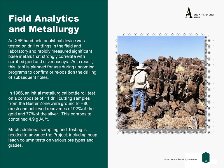 1 3 OTCQB : AHNR CSE: ATHA | OTCQB : AHNR © 2021 Athena Gold. All rights reserved. 1 3 An XRF hand - held analytical device was tested on drill cuttings in the field and laboratory and rapidly measured significant base metals that strongly correlate with certified gold and silver assays. As a result, this tool is planned for use during upcoming programs to confirm or re - position the drilling of subsequent holes. In 1986, an initial metallurgical bottle roll test on a composite of 11 drill cutting samples from the Buster Zone were ground to – 80 mesh and achieved recoveries of 92% of the gold and 77% of the silver. This composite contained 4.9 g Au/t. Much additional sampling and testing is needed to advance the Project, including heap leach column tests on various ore types and grades. Field Analytics and Metallurgy