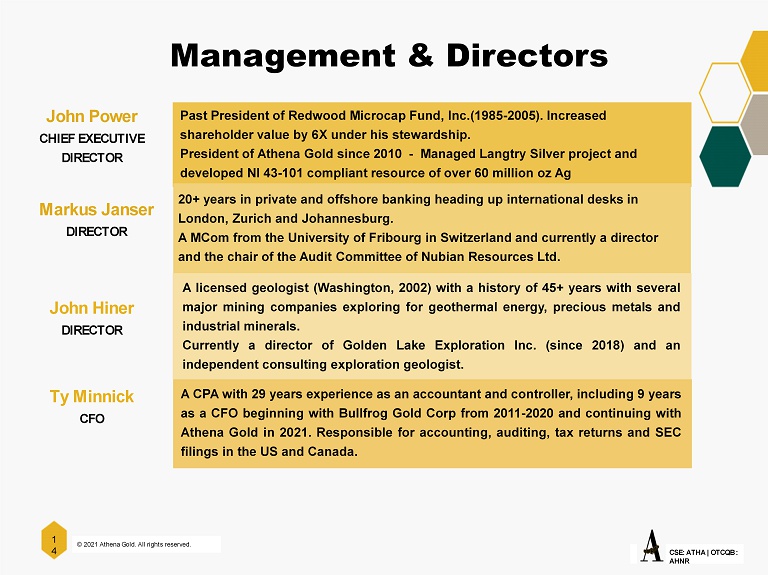 © 2021 Athena Gold. All rights reserved. 1 4 CSE: ATHA | OTCQB : AHNR Past President of Redwood Microcap Fund, Inc.(1985 - 2005). Increased shareholder value by 6X under his stewardship. President of Athena Gold since 2010 - Managed Langtry Silver project and developed NI 43 - 101 compliant resource of over 60 million oz Ag 20+ years in private and offshore banking heading up international desks in London, Zurich and Johannesburg. A MCom from the University of Fribourg in Switzerland and currently a director and the chair of the Audit Committee of Nubian Resources Ltd. John Power CHIEF EXECUTIVE DIRECTOR Markus Janser DIRECTOR Management & Directors John Hiner DIRECTOR A licensed geologist (Washington, 2002 ) with a history of 45 + years with several major mining companies exploring for geothermal energy, precious metals and industrial minerals . Currently a director of Golden Lake Exploration Inc . (since 2018 ) and an independent consulting exploration geologist . Ty Minnick CFO A CPA with 29 years experience as an accountant and controller, including 9 years as a CFO beginning with Bullfrog Gold Corp from 2011 - 2020 and continuing with Athena Gold in 2021 . Responsible for accounting, auditing, tax returns and SEC filings in the US and Canada .