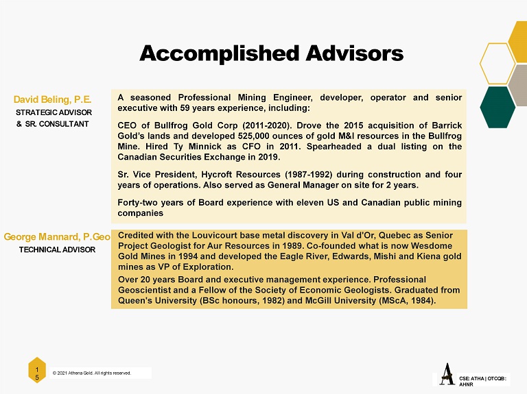© 2021 Athena Gold. All rights reserved. 1 5 CSE: ATHA | OTCQB : AHNR A seasoned Professional Mining Engineer, developer, operator and senior executive with 59 years experience, including : CEO of Bullfrog Gold Corp ( 2011 - 2020 ) . Drove the 2015 acquisition of Barrick Gold’s lands and developed 525 , 000 ounces of gold M&I resources in the Bullfrog Mine . Hired Ty Minnick as CFO in 2011 . Spearheaded a dual listing on the Canadian Securities Exchange in 2019 . Sr . Vice President, Hycroft Resources ( 1987 - 1992 ) during construction and four years of operations . Also served as General Manager on site for 2 years . Forty - two years of Board experience with eleven US and Canadian public mining companies David Beling, P.E. STRATEGIC ADVISOR & SR. CONSULTANT Credited with the Louvicourt base metal discovery in Val d'Or, Quebec as Senior Project Geologist for Aur Resources in 1989. Co - founded what is now Wesdome Gold Mines in 1994 and developed the Eagle River, Edwards, Mishi and Kiena gold mines as VP of Exploration. Over 20 years Board and executive management experience. Professional Geoscientist and a Fellow of the Society of Economic Geologists. Graduated from Queen's University (BSc honours, 1982) and McGill University (MScA, 1984). George Mannard, P.Geo TECHNICAL ADVISOR Accomplished Advisors
