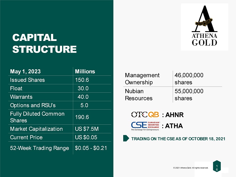1 6 OTCQB : AHNR CSE: ATHA | OTCQB : AHNR © 2021 Athena Gold. All rights reserved. 1 6 CAPITAL STRUCTURE Millions May 1, 2023 150.6 Issued Shares 30.0 Float 40.0 Warrants 5.0 Options and RSU’s 190.6 Fully Diluted Common Shares US $7.5M Market Capitalization US $0.05 Current Price $0.05 - $0.21 52 - Week Trading Range 46,000,000 shares Management Ownership 55,000,000 shares Nubian Resources : AHNR TRADING ON THE CSE AS OF OCTOBER 18, 2021 : ATHA
