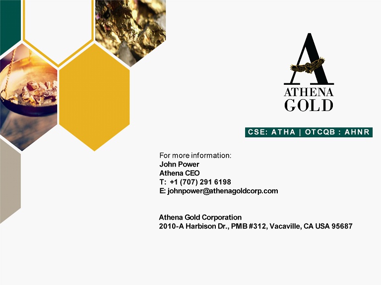 Athena Gold Corporation 2010 - A Harbison Dr., PMB #312, Vacaville, CA USA 95687 For more information: John Power Athena CEO T: +1 (707) 291 6198 E: johnpower@athenagoldcorp.com CSE: ATHA | OTCQB : AHNR