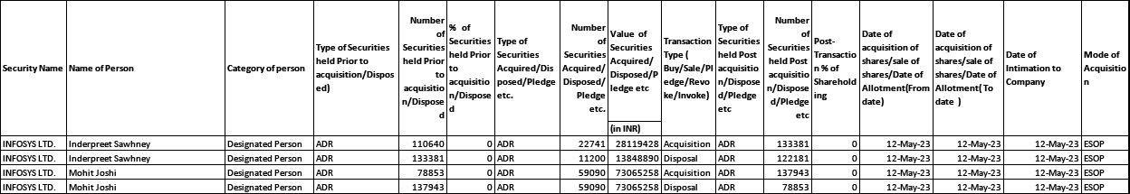 In compliance with the foregoing, the Company has disclosed the details of Securities acquired/disposed by the KMPs to the Stock Exchanges. Further, pursuant to SEC regulations, we hereby submit the following information pertaining to the securities acquired and disposed by KMPs of the Company as below: