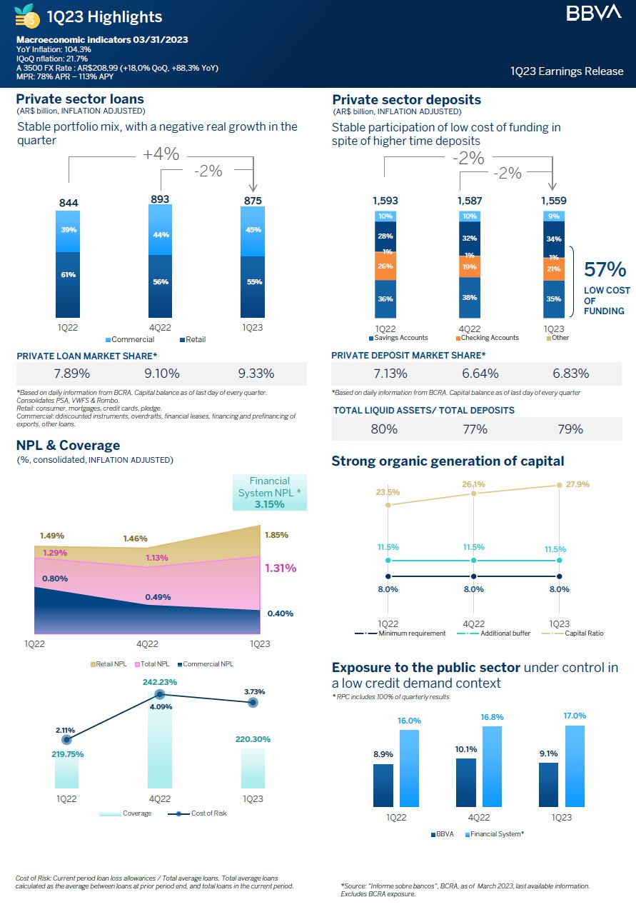 | · | In 1Q23, BBVA Argentina posted an inflation adjusted average return on assets (ROAA) of 2.6% and an inflation adjusted average return on equity (ROAE) of 13.7%. |