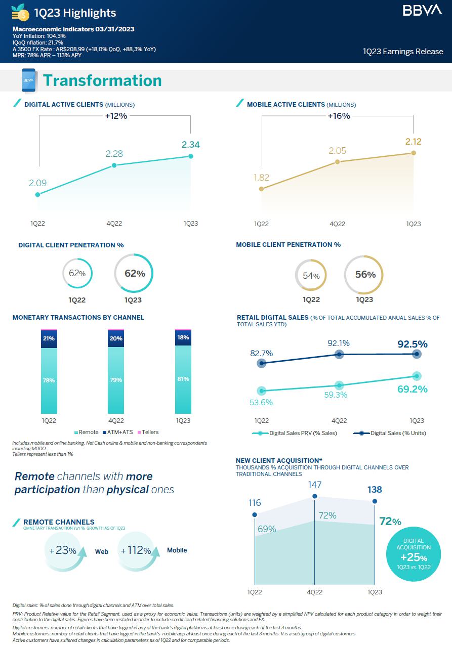 Relative to digitalization, our service offering has evolved in such way that by the end of March 2023, retail digital client penetration reached 62%, remaining stable versus a year back, while that of retail mobile clients reached 56% from 54% in the same period. In the quarter, new client acquisition through digital channels over traditional ones was 72%, while in 1Q22 it was 69%.