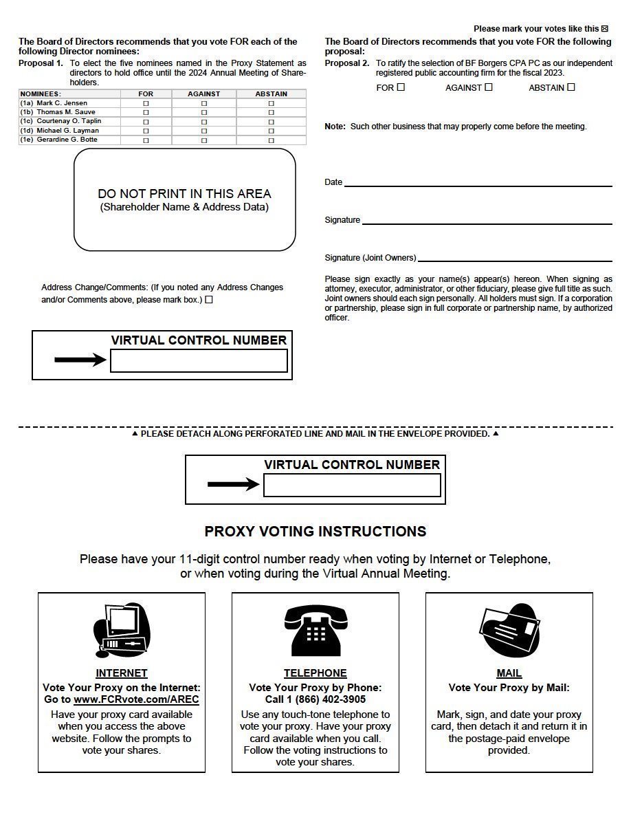 You may vote by proxy over the Internet at www.FCRvote.com/AREC,by toll-free telephone at 1 (866) 402-3905, or, if you requested and received paper copies of the proxy materials, you can also vote by mail by following the instructions on the proxy card or voting instruction card. Voting over the Internet, by telephone or by written proxy or voting instruction card will ensure your representation at the meeting regardless of whether you attend the virtual meeting.