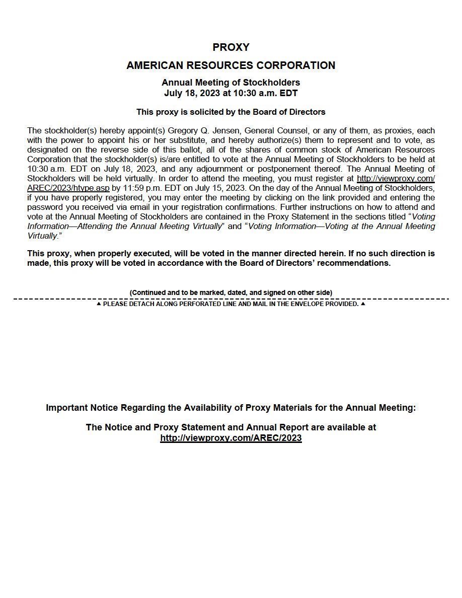 You are cordially invited to attend the 2023 Annual Meeting of Shareholders of American Resources Corporation (herein referred to as the “Company,” “American Resources,” “us,” “our,” and “we”). This is your notice for the meeting. We will again be conducting our Annual Meeting of Shareholders (“Annual Meeting”) solely in a virtual format, on the below date and time, via live audio webcast. You or your proxyholder may participate, vote at the Annual Meeting by first registering at http://viewproxy.com/AREC/2023/htype.asp.You will receive a meeting invitation by e-mail with your unique join link along with a password prior to the meeting date. Stockholders will be able to listen, vote and submit questions during the virtual meeting.