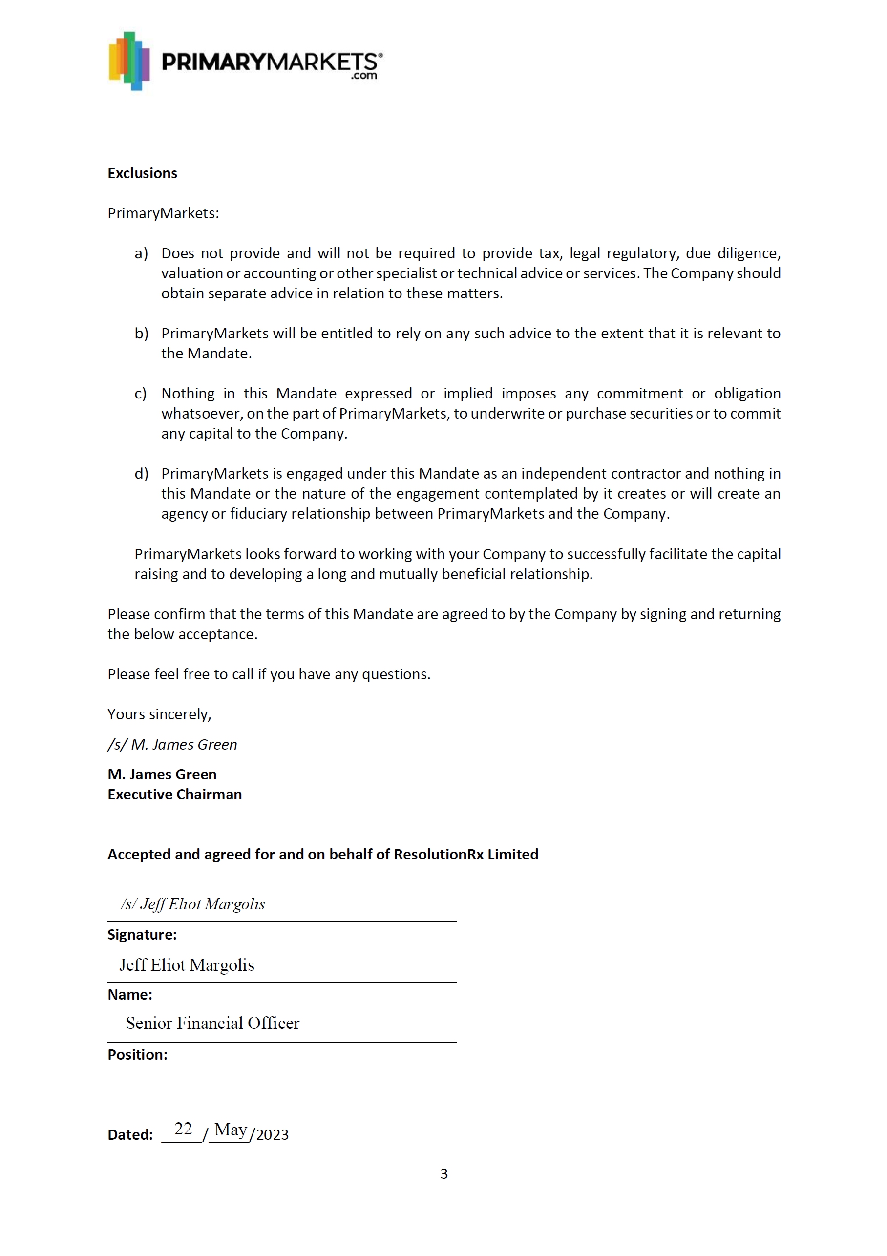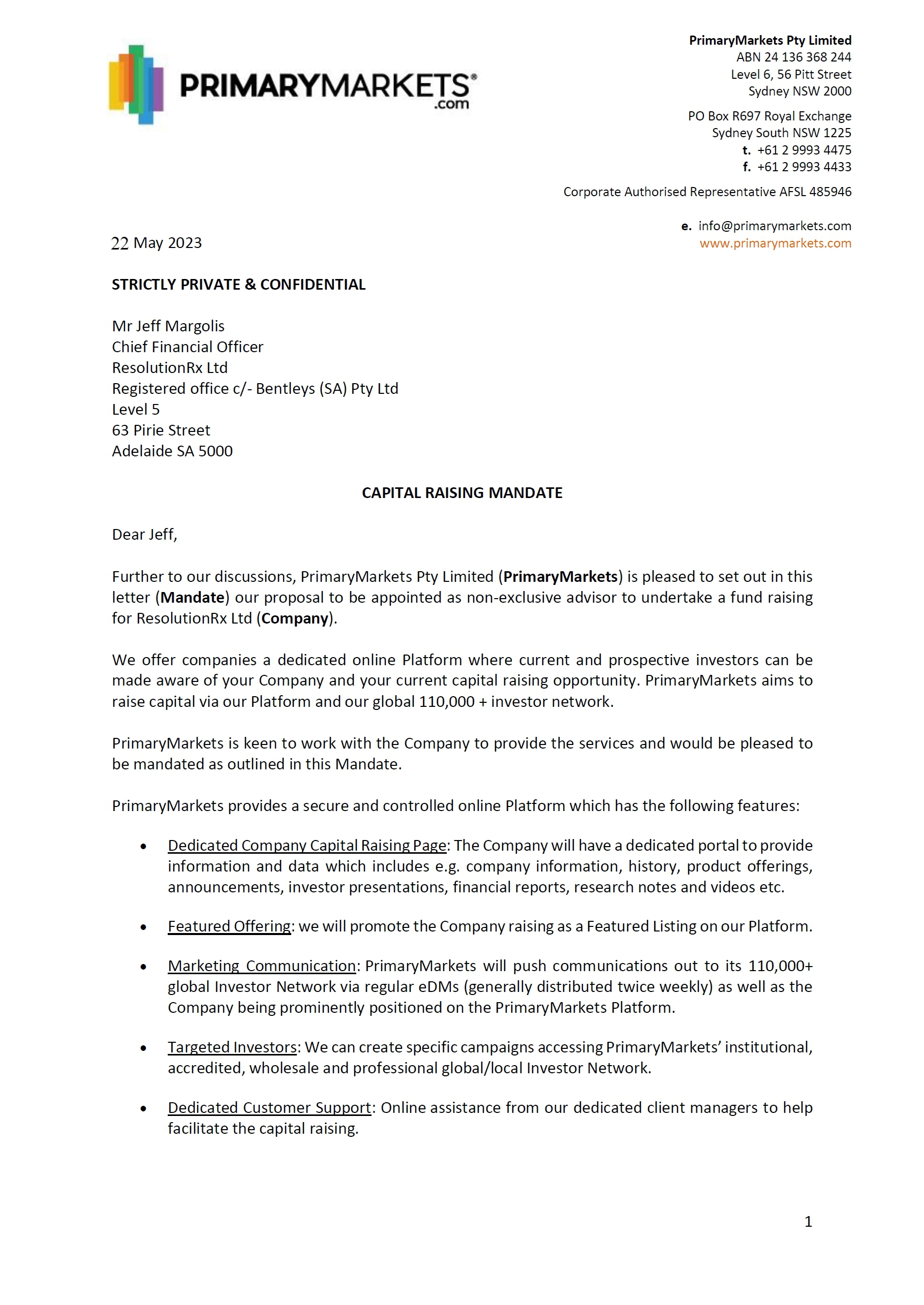 On May 22, 2023, ResolutionRx and PrimaryMarkets Pty Limited (“PrimaryMarkets”) entered into a capital raising mandate (“Mandate”) pursuant to which PrimaryMarkets was appointed as non-exclusive advisor to undertake a fund raising for ResolutionRx.