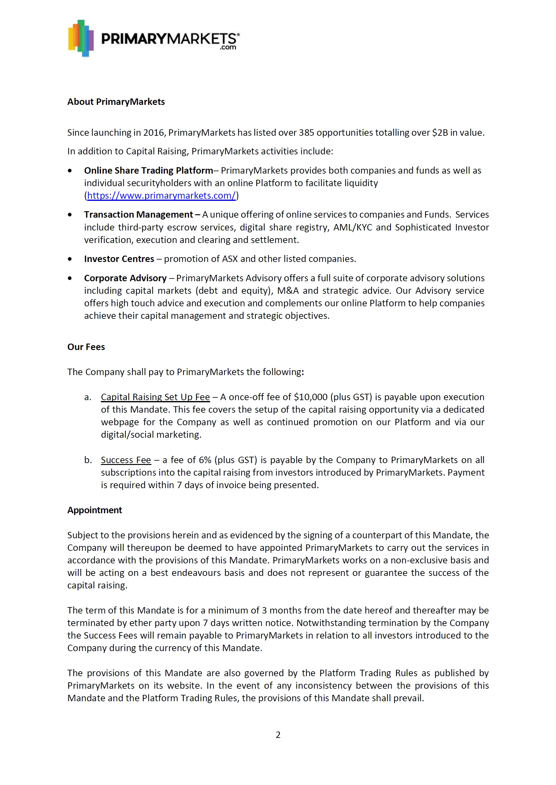 ● Marketing Communication: PrimaryMarkets will push communications out to its 110,000+ global Investor Network via regular eDMs (generally distributed twice weekly) as well as the Company being prominently positioned on the PrimaryMarkets Platform.