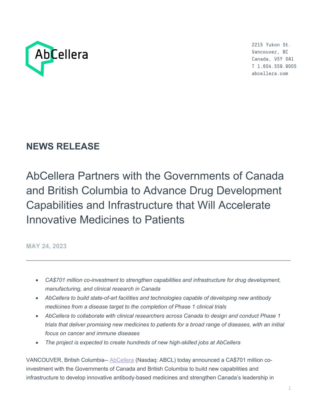 1 NEWS RELEASE AbCellera Partners with the Governments of Canada and British Columbia to Advance Drug Development Capabilities and Infrastructure that Will Accelerate Innovative Medicines to Patients MAY 24, 2023 • CA$701 million co-investment to strengthen capabilities and infrastructure for drug development, manufacturing, and clinical research in Canada • AbCellera to build state-of-art facilities and technologies capable of developing new antibody medicines from a disease target to the completion of Phase 1 clinical trials • AbCellera to collaborate with clinical researchers across Canada to design and conduct Phase 1 trials that deliver promising new medicines to patients for a broad range of diseases, with an initial focus on cancer and immune diseases • The project is expected to create hundreds of new high-skilled jobs at AbCellera VANCOUVER, British Columbia-- AbCellera (Nasdaq: ABCL) today announced a CA$701 million co- investment with the Governments of Canada and British Columbia to build new capabilities and infrastructure to develop innovative antibody-based medicines and strengthen Canada’s leadership in