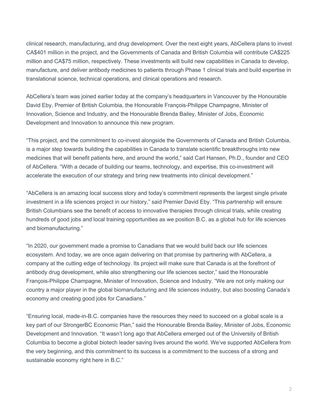 2 clinical research, manufacturing, and drug development. Over the next eight years, AbCellera plans to invest CA$401 million in the project, and the Governments of Canada and British Columbia will contribute CA$225 million and CA$75 million, respectively. These investments will build new capabilities in Canada to develop, manufacture, and deliver antibody medicines to patients through Phase 1 clinical trials and build expertise in translational science, technical operations, and clinical operations and research. AbCellera’s team was joined earlier today at the company’s headquarters in Vancouver by the Honourable David Eby, Premier of British Columbia, the Honourable François-Philippe Champagne, Minister of Innovation, Science and Industry, and the Honourable Brenda Bailey, Minister of Jobs, Economic Development and Innovation to announce this new program. “This project, and the commitment to co-invest alongside the Governments of Canada and British Columbia, is a major step towards building the capabilities in Canada to translate scientific breakthroughs into new medicines that will benefit patients here, and around the world,” said Carl Hansen, Ph.D., founder and CEO of AbCellera. “With a decade of building our teams, technology, and expertise, this co-investment will accelerate the execution of our strategy and bring new treatments into clinical development.” “AbCellera is an amazing local success story and today’s commitment represents the largest single private investment in a life sciences project in our history,” said Premier David Eby. “This partnership will ensure British Columbians see the benefit of access to innovative therapies through clinical trials, while creating hundreds of good jobs and local training opportunities as we position B.C. as a global hub for life sciences and biomanufacturing.” “In 2020, our government made a promise to Canadians that we would build back our life sciences ecosystem. And today, we are once again delivering on that promise by partnering with AbCellera, a company at the cutting edge of technology. Its project will make sure that Canada is at the forefront of antibody drug development, while also strengthening our life sciences sector,” said the Honourable François-Philippe Champagne, Minister of Innovation, Science and Industry. “We are not only making our country a major player in the global biomanufacturing and life sciences industry, but also boosting Canada’s economy and creating good jobs for Canadians.” “Ensuring local, made-in-B.C. companies have the resources they need to succeed on a global scale is a key part of our StrongerBC Economic Plan,” said the Honourable Brenda Bailey, Minister of Jobs, Economic Development and Innovation. “It wasn’t long ago that AbCellera emerged out of the University of British Columbia to become a global biotech leader saving lives around the world. We’ve supported AbCellera from the very beginning, and this commitment to its success is a commitment to the success of a strong and sustainable economy right here in B.C.”