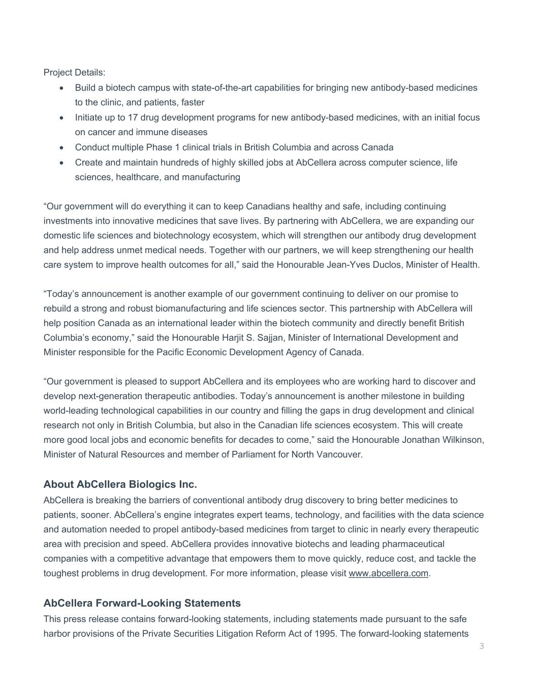3 Project Details: • Build a biotech campus with state-of-the-art capabilities for bringing new antibody-based medicines to the clinic, and patients, faster • Initiate up to 17 drug development programs for new antibody-based medicines, with an initial focus on cancer and immune diseases • Conduct multiple Phase 1 clinical trials in British Columbia and across Canada • Create and maintain hundreds of highly skilled jobs at AbCellera across computer science, life sciences, healthcare, and manufacturing “Our government will do everything it can to keep Canadians healthy and safe, including continuing investments into innovative medicines that save lives. By partnering with AbCellera, we are expanding our domestic life sciences and biotechnology ecosystem, which will strengthen our antibody drug development and help address unmet medical needs. Together with our partners, we will keep strengthening our health care system to improve health outcomes for all,” said the Honourable Jean-Yves Duclos, Minister of Health. “Today’s announcement is another example of our government continuing to deliver on our promise to rebuild a strong and robust biomanufacturing and life sciences sector. This partnership with AbCellera will help position Canada as an international leader within the biotech community and directly benefit British Columbia’s economy,” said the Honourable Harjit S. Sajjan, Minister of International Development and Minister responsible for the Pacific Economic Development Agency of Canada. “Our government is pleased to support AbCellera and its employees who are working hard to discover and develop next-generation therapeutic antibodies. Today’s announcement is another milestone in building world-leading technological capabilities in our country and filling the gaps in drug development and clinical research not only in British Columbia, but also in the Canadian life sciences ecosystem. This will create more good local jobs and economic benefits for decades to come,” said the Honourable Jonathan Wilkinson, Minister of Natural Resources and member of Parliament for North Vancouver. About AbCellera Biologics Inc. AbCellera is breaking the barriers of conventional antibody drug discovery to bring better medicines to patients, sooner. AbCellera’s engine integrates expert teams, technology, and facilities with the data science and automation needed to propel antibody-based medicines from target to clinic in nearly every therapeutic area with precision and speed. AbCellera provides innovative biotechs and leading pharmaceutical companies with a competitive advantage that empowers them to move quickly, reduce cost, and tackle the toughest problems in drug development. For more information, please visit www.abcellera.com. AbCellera Forward-Looking Statements This press release contains forward-looking statements, including statements made pursuant to the safe harbor provisions of the Private Securities Litigation Reform Act of 1995. The forward-looking statements