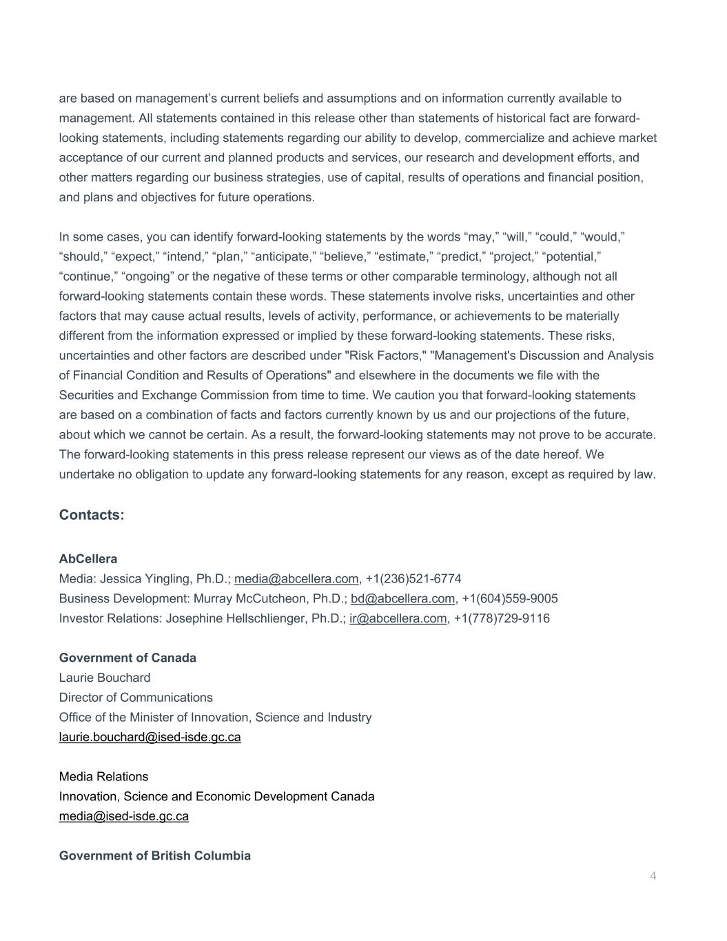 4 are based on management’s current beliefs and assumptions and on information currently available to management. All statements contained in this release other than statements of historical fact are forward- looking statements, including statements regarding our ability to develop, commercialize and achieve market acceptance of our current and planned products and services, our research and development efforts, and other matters regarding our business strategies, use of capital, results of operations and financial position, and plans and objectives for future operations. In some cases, you can identify forward-looking statements by the words “may,” “will,” “could,” “would,” “should,” “expect,” “intend,” “plan,” “anticipate,” “believe,” “estimate,” “predict,” “project,” “potential,” “continue,” “ongoing” or the negative of these terms or other comparable terminology, although not all forward-looking statements contain these words. These statements involve risks, uncertainties and other factors that may cause actual results, levels of activity, performance, or achievements to be materially different from the information expressed or implied by these forward-looking statements. These risks, uncertainties and other factors are described under "Risk Factors," "Management's Discussion and Analysis of Financial Condition and Results of Operations" and elsewhere in the documents we file with the Securities and Exchange Commission from time to time. We caution you that forward-looking statements are based on a combination of facts and factors currently known by us and our projections of the future, about which we cannot be certain. As a result, the forward-looking statements may not prove to be accurate. The forward-looking statements in this press release represent our views as of the date hereof. We undertake no obligation to update any forward-looking statements for any reason, except as required by law. Contacts: AbCellera Media: Jessica Yingling, Ph.D.; media@abcellera.com, +1(236)521-6774 Business Development: Murray McCutcheon, Ph.D.; bd@abcellera.com, +1(604)559-9005 Investor Relations: Josephine Hellschlienger, Ph.D.; ir@abcellera.com, +1(778)729-9116 Government of Canada Laurie Bouchard Director of Communications Office of the Minister of Innovation, Science and Industry laurie.bouchard@ised-isde.gc.ca Media Relations Innovation, Science and Economic Development Canada media@ised-isde.gc.ca Government of British Columbia