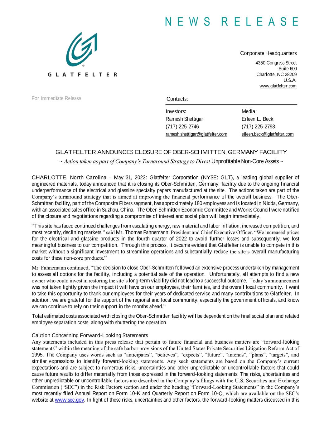 For Immediate Release Investors: Media: Ramesh Shettigar Eileen L. Beck (717) 225-2746 (717) 225-2793 ramesh.shettigar@glatfelter.com eileen.beck@glatfelter.com GLATFELTER ANNOUNCES CLOSURE OF OBER-SCHMITTEN, GERMANY FACILITY ~ Action taken as part of Company’s Turnaround Strategy to Divest Unprofitable Non-Core Assets ~ CHARLOTTE, North Carolina – May 31, 2023: Glatfelter Corporation (NYSE: GLT), a leading global supplier of engineered materials, today announced that it is closing its Ober-Schmitten, Germany, facility due to the ongoing financial underperformance of the electrical and glassine specialty papers manufactured at the site. The actions taken are part of the Company’s turnaround strategy that is aimed at improving the financial performance of the overall business. The Ober- Schmitten facility, part of the Composite Fibers segment, has approximately 180 employees and is located in Nidda, Germany, with an associated sales office in Suzhou, China. The Ober-Schmitten Economic Committee and Works Council were notified of the closure and negotiations regarding a compromise of interest and social plan will begin immediately. “This site has faced continued challenges from escalating energy, raw material and labor inflation, increased competition, and most recently, declining markets,” said Mr. Thomas Fahnemann, President and Chief Executive Officer. “We increased prices for the electrical and glassine products in the fourth quarter of 2022 to avoid further losses and subsequently, we lost meaningful business to our competition. Through this process, it became evident that Glatfelter is unable to compete in this market without a significant investment to streamline operations and substantially reduce the site’s overall manufacturing costs for these non-core products.” Mr. Fahnemann continued, “The decision to close Ober-Schmitten followed an extensive process undertaken by management to assess all options for the facility, including a potential sale of the operation. Unfortunately, all attempts to find a new owner who could invest in restoring the site’s long-term viability did not lead to a successful outcome. Today’s announcement was not taken lightly given the impact it will have on our employees, their families, and the overall local community. I want to take this opportunity to thank our employees for their years of dedicated service and many contributions to Glatfelter. In addition, we are grateful for the support of the regional and local community, especially the government officials, and know we can continue to rely on their support in the months ahead.” Total estimated costs associated with closing the Ober-Schmitten facility will be dependent on the final social plan and related employee separation costs, along with shuttering the operation. Caution Concerning Forward-Looking Statements Any statements included in this press release that pertain to future financial and business matters are “forward-looking statements” within the meaning of the safe harbor provisions of the United States Private Securities Litigation Reform Act of 1995. The Company uses words such as “anticipates”, “believes”, “expects”, “future”, “intends”, “plans”, “targets”, and similar expressions to identify forward-looking statements. Any such statements are based on the Company’s current expectations and are subject to numerous risks, uncertainties and other unpredictable or uncontrollable factors that could cause future results to differ materially from those expressed in the forward-looking statements. The risks, uncertainties and other unpredictable or uncontrollable factors are described in the Company’s filings with the U.S. Securities and Exchange Commission (“SEC”) in the Risk Factors section and under the heading “Forward-Looking Statements” in the Company’s most recently filed Annual Report on Form 10-K and Quarterly Report on Form 10-Q, which are available on the SEC’s website at www.sec.gov. In light of these risks, uncertainties and other factors, the forward-looking matters discussed in this N E W S R E L E A S E Corporate Headquarters 4350 Congress Street Suite 600 Charlotte, NC 28209 U.S.A. www.glatfelter.com Contacts: