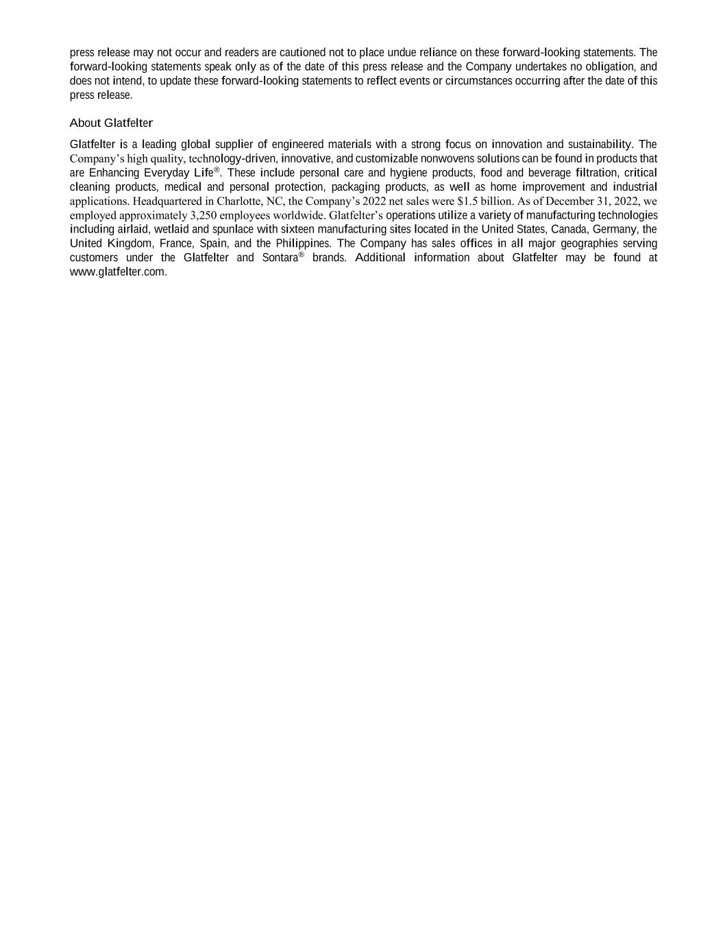 press release may not occur and readers are cautioned not to place undue reliance on these forward-looking statements. The forward-looking statements speak only as of the date of this press release and the Company undertakes no obligation, and does not intend, to update these forward-looking statements to reflect events or circumstances occurring after the date of this press release. About Glatfelter Glatfelter is a leading global supplier of engineered materials with a strong focus on innovation and sustainability. The Company’s high quality, technology-driven, innovative, and customizable nonwovens solutions can be found in products that are Enhancing Everyday Life®. These include personal care and hygiene products, food and beverage filtration, critical cleaning products, medical and personal protection, packaging products, as well as home improvement and industrial applications. Headquartered in Charlotte, NC, the Company’s 2022 net sales were $1.5 billion. As of December 31, 2022, we employed approximately 3,250 employees worldwide. Glatfelter’s operations utilize a variety of manufacturing technologies including airlaid, wetlaid and spunlace with sixteen manufacturing sites located in the United States, Canada, Germany, the United Kingdom, France, Spain, and the Philippines. The Company has sales offices in all major geographies serving customers under the Glatfelter and Sontara® brands. Additional information about Glatfelter may be found at www.glatfelter.com.