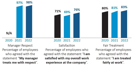 RESULTS: In our ABK Upward survey for 2022, 90% of eligible managers received a personalized feedback report, and we saw positive ratings increases across the Company and within each business unit in our engagement surveys, compared to the prior year. See the subsection titled “Listening to Our Employees” below for more information.