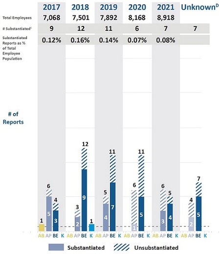 The data set was compiled in June 2022 by external advisors for third party review, and reflects concerns that were received and investigated and occurred between September 1, 2016 and December 31, 2021, and deemed to raise a potential violation of the anti-harassment policy (as to sex/gender), of which the Company was aware through: (i) our Integrated Investigations Unit; (ii) Employee Relations; (iii) the Navex database; and (iv) information collected from various human resources groups of our U.S. operations. The chart below does not reflect duplicate reported concerns or alleged incidents reported during this time but alleging events that occurred in other years. Reports related to this time period received, investigated, or closed after December 31, 2021, also would not be reflected.