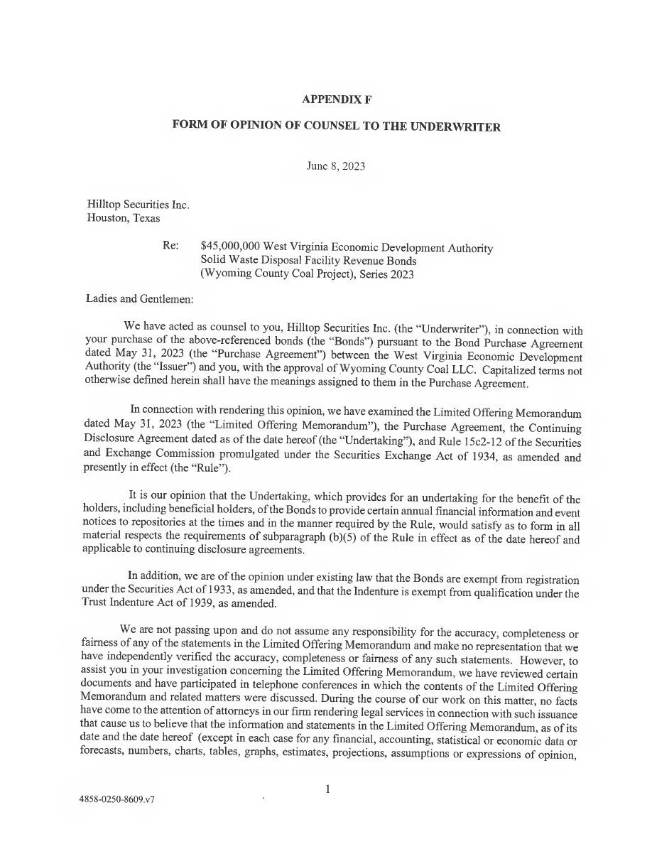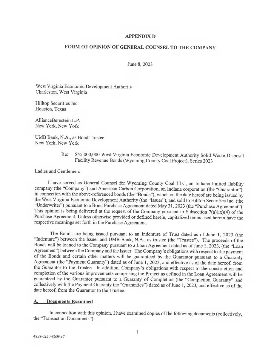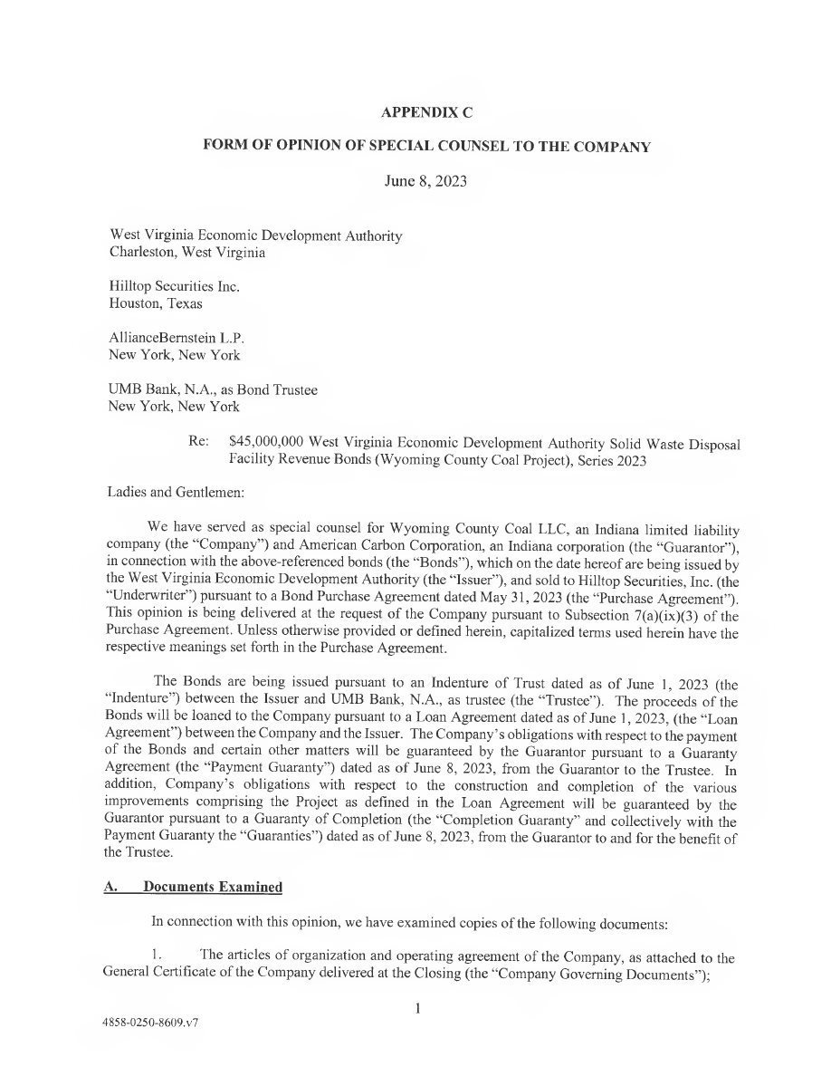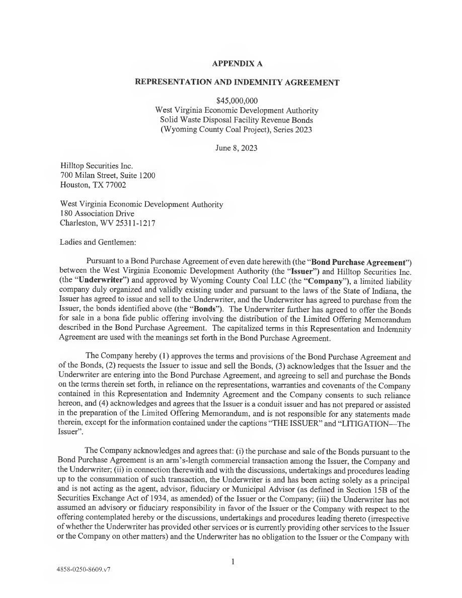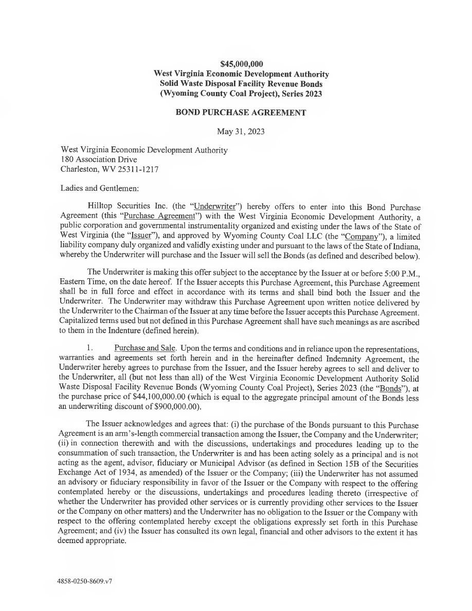 On May 31, 2023, WCC entered into a Bond Purchase Agreement to sell West Virginia Development Authority Solid Waste Disposal Facility Revenue Bonds, Series 2023, at the purchase price of $45,000,000 less an underwriting discount of $900,000. The bonds hold an interest rate of 9% and a maturity date of June 8, 2038. The Bond Purchase Agreement is due to close on June 8, 2023, subject to customary closing conditions and document delivery.