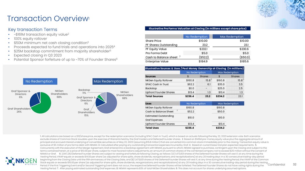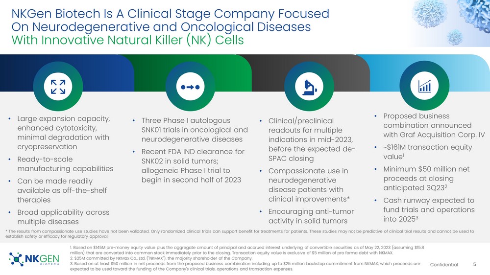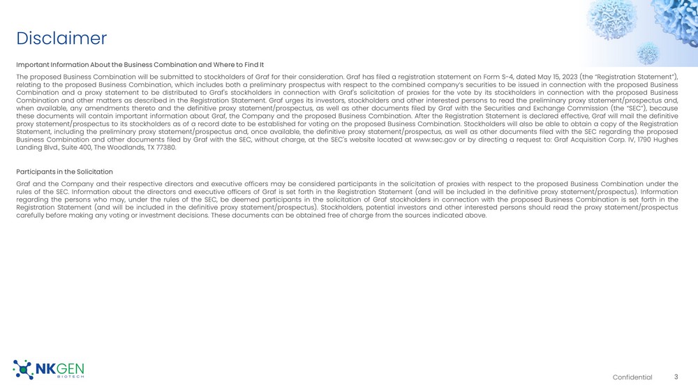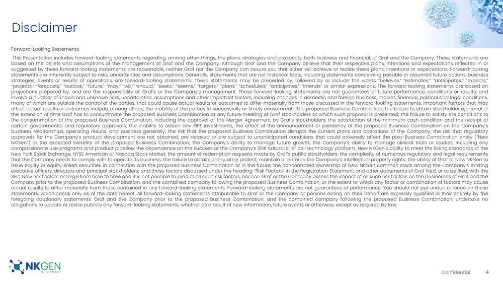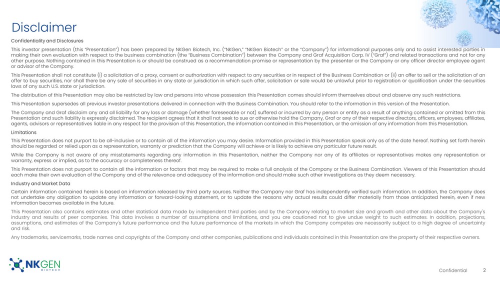 This Current Report includes forward-looking statements regarding, among other things, the plans, strategies and prospects, both business and financial, of Graf and NKGen. These statements are based on the beliefs and assumptions of the management of Graf and NKGen. Although Graf and NKGen believe that their respective plans, intentions and expectations reflected in or suggested by these forward-looking statements are reasonable, neither Graf nor NKGen can assure you that either will achieve or realize these plans, intentions or expectations. Forward-looking statements are inherently subject to risks, uncertainties and assumptions. Generally, statements that are not historical facts, including statements concerning possible or assumed future actions, business strategies, events or results of operations, are forward-looking statements. These statements may be preceded by, followed by or include the words “believes,” “estimates,” “anticipates,” “expects,” “projects,” “forecasts,” “outlook,” “future,” “may,” “will,” “should,” “seeks,” “seems,” “targets,” “plans,” “scheduled,” “anticipates,” “intends” or similar expressions. The forward-looking statements are based on projections prepared by, and are the responsibility of, Graf’s or NKGen’s management. These forward-looking statements are not guarantees of future performance, conditions or results, and involve a number of known and unknown risks, uncertainties, assumptions and other important factors, including changes in domestic and foreign business, market, financial, political and legal conditions, many of which are outside the control of the parties, that could cause actual results or outcomes to differ materially from those discussed in the forward-looking statements. Important factors that may affect actual results or outcomes include, among others, the inability of the parties to successfully or timely consummate the proposed Business Combination; the failure to obtain stockholder approval of the extension of time Graf has to consummate the proposed Business Combination at any future meeting of Graf stockholders at which such proposal is presented; the failure to satisfy the conditions to the consummation of the proposed Business Combination, including the approval of the Merger Agreement by Graf’s stockholders, the satisfaction of the minimum cash condition and the receipt of certain governmental and regulatory approvals; the inability to obtain any PIPE investments; the effect of the announcement or pendency of the proposed Business Combination on NKGen’s business relationships, operating results, and business generally; the risk that the proposed Business Combination disrupts the current plans and operations of NKGen; the risk that regulatory approvals for NKGen’s product development are not obtained, are delayed or are subject to unanticipated conditions that could adversely affect the post-Business Combination entity (“New NKGen”) or the expected benefits of the proposed Business Combination; NKGen’s ability to manage future growth; NKGen’s ability to manage clinical trials or studies, including any compassionate use programs and product pipeline; the dependence on the success of NKGen’s SNK natural killer cell technology platform; New NKGen’s ability to meet the listing standards of the New York Stock Exchange, NYSE American or, Nasdaq Stock Market; the amount of redemption requests made by Graf’s public stockholders; the complexity of numerous regulatory and legal requirements that NKGen needs to comply with to operate its business; the failure to obtain, adequately protect, maintain or enforce NKGen’s intellectual property rights; the ability of Graf or New NKGen to issue equity or equity-linked securities in connection with the proposed Business Combination or in the future; the concentrated ownership of New NKGen common stock among NKGen’s existing executive officers, directors and principal stockholders; and those factors discussed under the heading “Risk Factors” in the Registration Statement and other documents of Graf filed, or to be filed, with the SEC. New risk factors emerge from time to time and it is not possible to predict all such risk factors, nor can Graf or NKGen assess the impact of all such risk factors on the businesses of Graf and NKGen prior to the proposed Business Combination, and the combined company following the proposed Business Combination, or the extent to which any factor or combination of factors may cause actual results to differ materially from those contained in any forward-looking statements. Forward-looking statements are not guarantees of performance. You should not put undue reliance on these statements, which speak only as of the date hereof. All forward-looking statements attributable to Graf or NKGen or persons acting on their behalf are expressly qualified in their entirety by the foregoing cautionary statements. Graf and NKGen prior to the proposed Business Combination, and the combined company following the proposed Business Combination, undertake no obligations to update or revise publicly any forward-looking statements, whether as a result of new information, future events or otherwise, except as required by law.