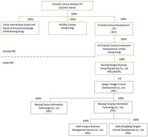 The Company, we, us, our company, Oriental Culture, OCG, holding company and our are referred to Oriental Culture Holding LTD., a holding company incorporated under the laws of the Cayman Islands and its subsidiaries. We currently conduct our business through China International Assets and Equity of Artworks Exchange Limited (“International Exchange”) and HKDAEx Limited (“HKDAEx”), our operating subsidiaries in Hong Kong and the VIE Jiangsu Yanggu Culture Development Co., Ltd. (“Jiangsu Yanggu”) and its operating subsidiaries Nanjing Yanyu Information Technology Co., Ltd. (“Nanjing Yanyu”), Nanjing Yanqing Information Technology Co., Ltd., (“Nanjing Yanqing”), Kashi Longrui Business Management Services Co., Ltd. (“Kashi Longrui”) and Kashi Dongfang Cangpin Culture Development Co., Ltd. (“Kashi Dongfang”) in China. Jiangsu Yanggu and its shareholders entered into a series of contractual arrangements with Nanjing Rongke Business Consulting Service Co., Ltd. (“WFOE”), a company incorporated in China and a wholly owned subsidiary of HK Oriental Culture Investment Development Limited (“Oriental Culture HK”), which is a holding company incorporated in Hong Kong and a wholly owned subsidiary of Oriental Culture.