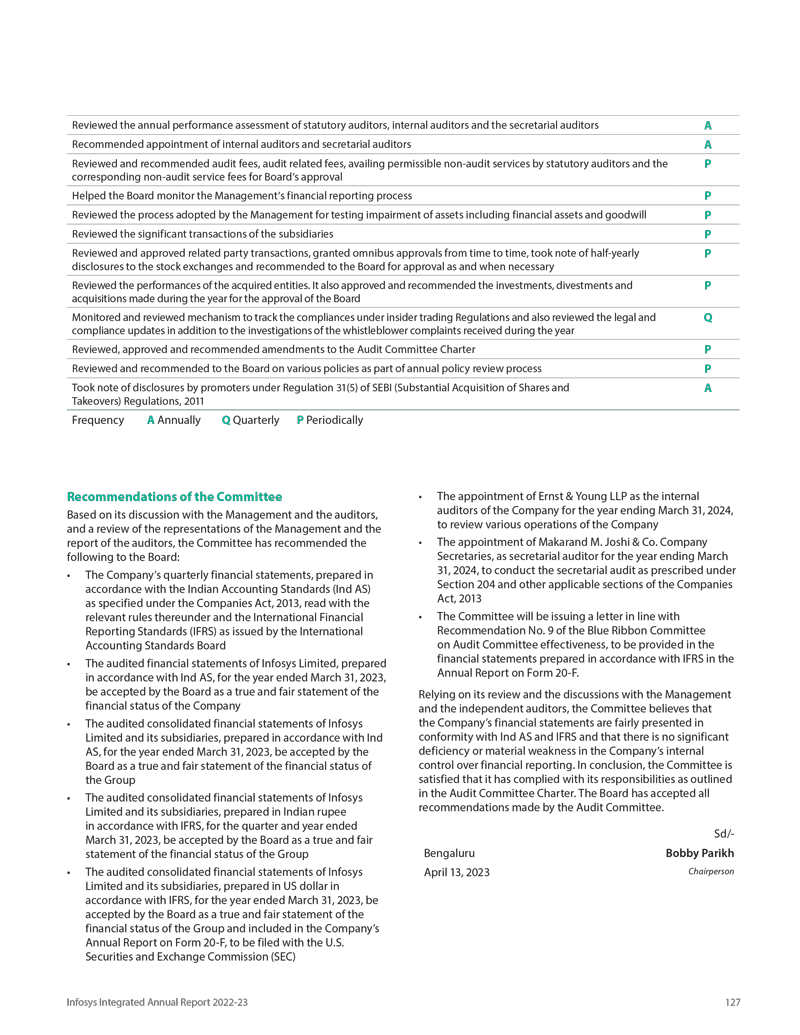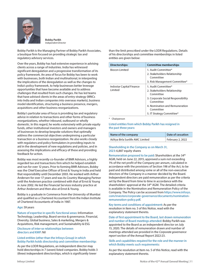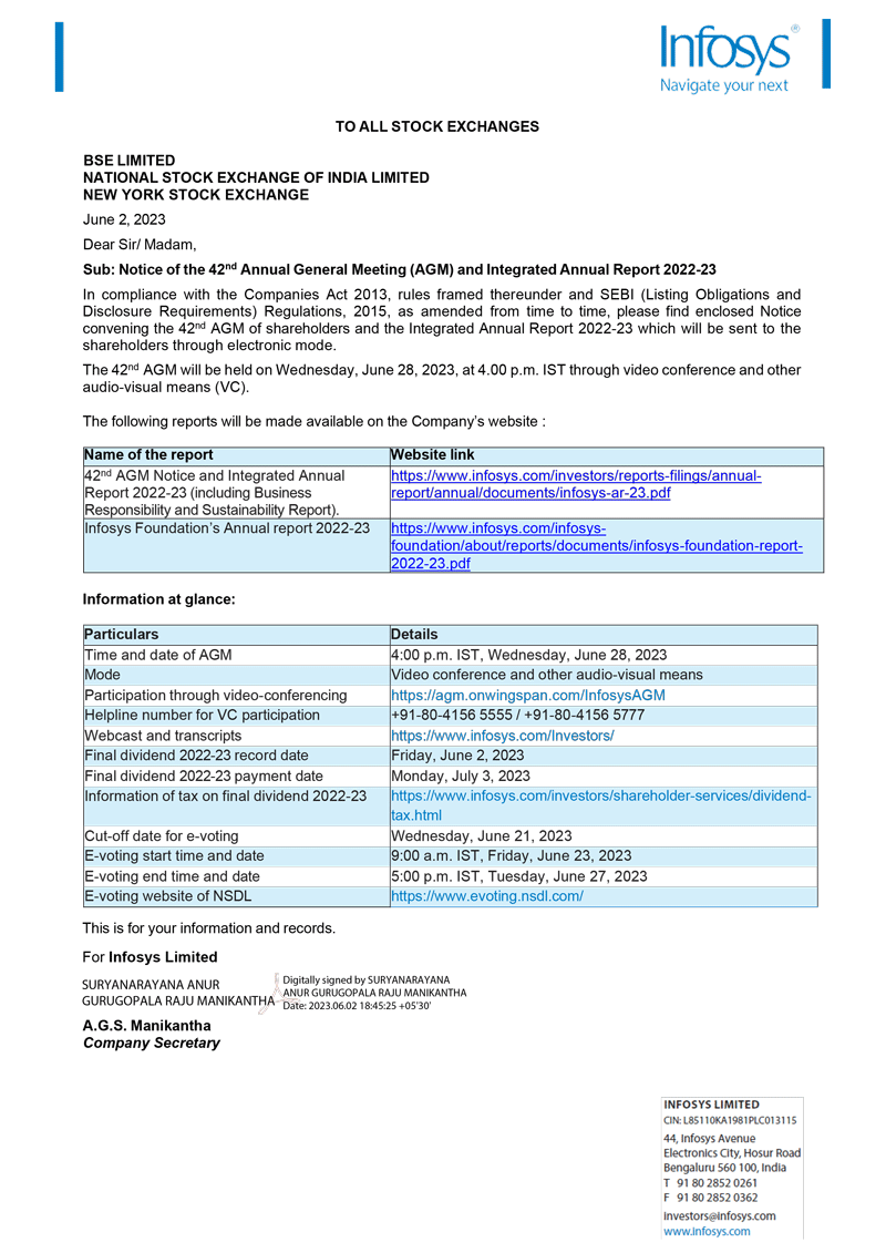 Infosys Limited, a company organized under the laws of the Republic of India ("Infosys", or the "Company"), hereby furnishes with the United States Securities and Exchange Commission this Report on Form 6-K regarding the stock exchange intimation dated June 2, 2023 regarding intimation of the Notice of the 42nd Annual General Meeting (AGM) and Integrated Annual Report 2022-23.