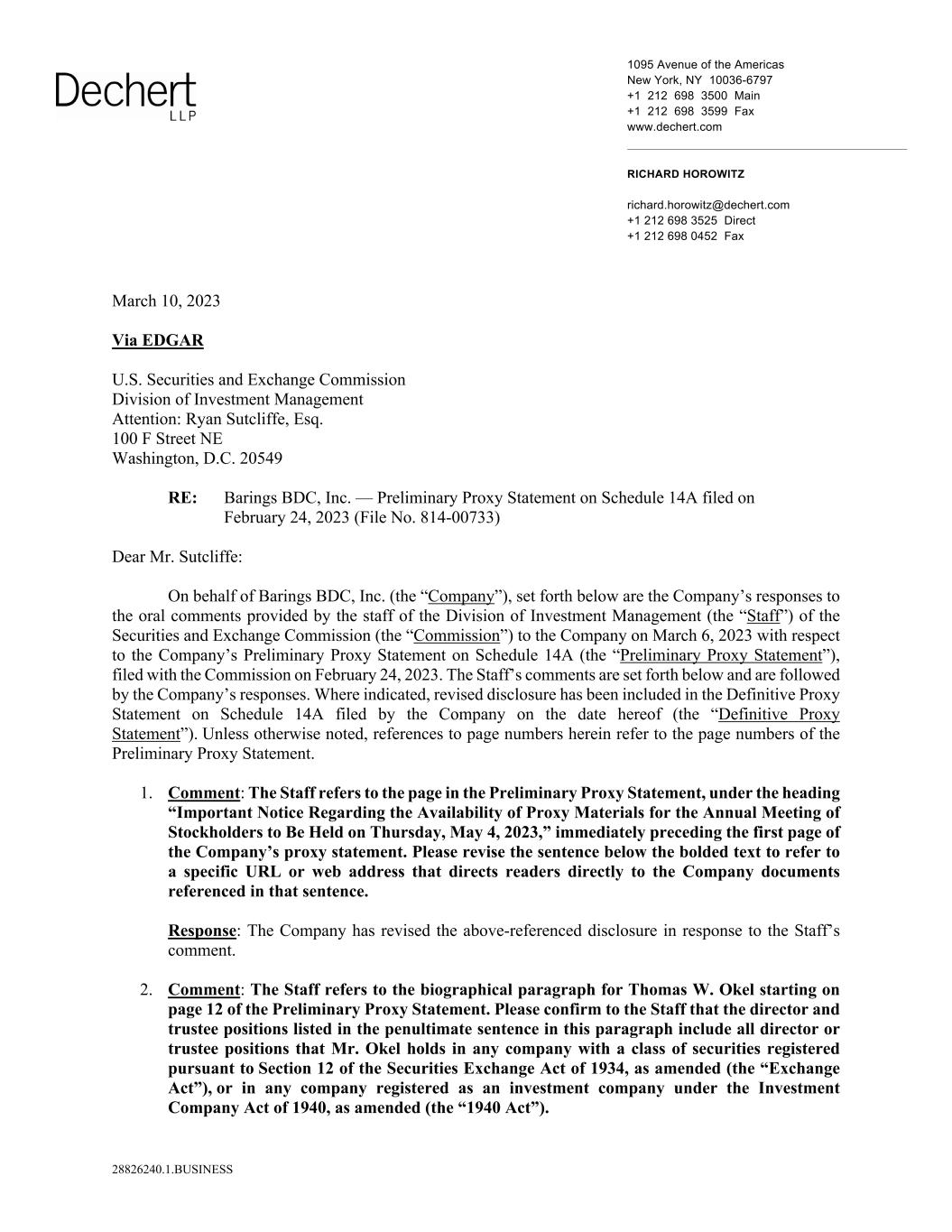 1095 Avenue of the Americas New York, NY 10036-6797 +1 212 698 3500 Main +1 212 698 3599 Fax www.dechert.com RICHARD HOROWITZ richard.horowitz@dechert.com +1 212 698 3525 Direct +1 212 698 0452 Fax 28826240.1.BUSINESS March 10, 2023 Via EDGAR U.S. Securities and Exchange Commission Division of Investment Management Attention: Ryan Sutcliffe, Esq. 100 F Street NE Washington, D.C. 20549 RE: Barings BDC, Inc. — Preliminary Proxy Statement on Schedule 14A filed on February 24, 2023 (File No. 814-00733) Dear Mr. Sutcliffe: On behalf of Barings BDC, Inc. (the “Company”), set forth below are the Company’s responses to the oral comments provided by the staff of the Division of Investment Management (the “Staff”) of the Securities and Exchange Commission (the “Commission”) to the Company on March 6, 2023 with respect to the Company’s Preliminary Proxy Statement on Schedule 14A (the “Preliminary Proxy Statement”), filed with the Commission on February 24, 2023. The Staff’s comments are set forth below and are followed by the Company’s responses. Where indicated, revised disclosure has been included in the Definitive Proxy Statement on Schedule 14A filed by the Company on the date hereof (the “Definitive Proxy Statement”). Unless otherwise noted, references to page numbers herein refer to the page numbers of the Preliminary Proxy Statement. 1. Comment: The Staff refers to the page in the Preliminary Proxy Statement, under the heading “Important Notice Regarding the Availability of Proxy Materials for the Annual Meeting of Stockholders to Be Held on Thursday, May 4, 2023,” immediately preceding the first page of the Company’s proxy statement. Please revise the sentence below the bolded text to refer to a specific URL or web address that directs readers directly to the Company documents referenced in that sentence. Response: The Company has revised the above-referenced disclosure in response to the Staff’s comment. 2. Comment: The Staff refers to the biographical paragraph for Thomas W. Okel starting on page 12 of the Preliminary Proxy Statement. Please confirm to the Staff that the director and trustee positions listed in the penultimate sentence in this paragraph include all director or trustee positions that Mr. Okel holds in any company with a class of securities registered pursuant to Section 12 of the Securities Exchange Act of 1934, as amended (the “Exchange Act”), or in any company registered as an investment company under the Investment Company Act of 1940, as amended (the “1940 Act”).