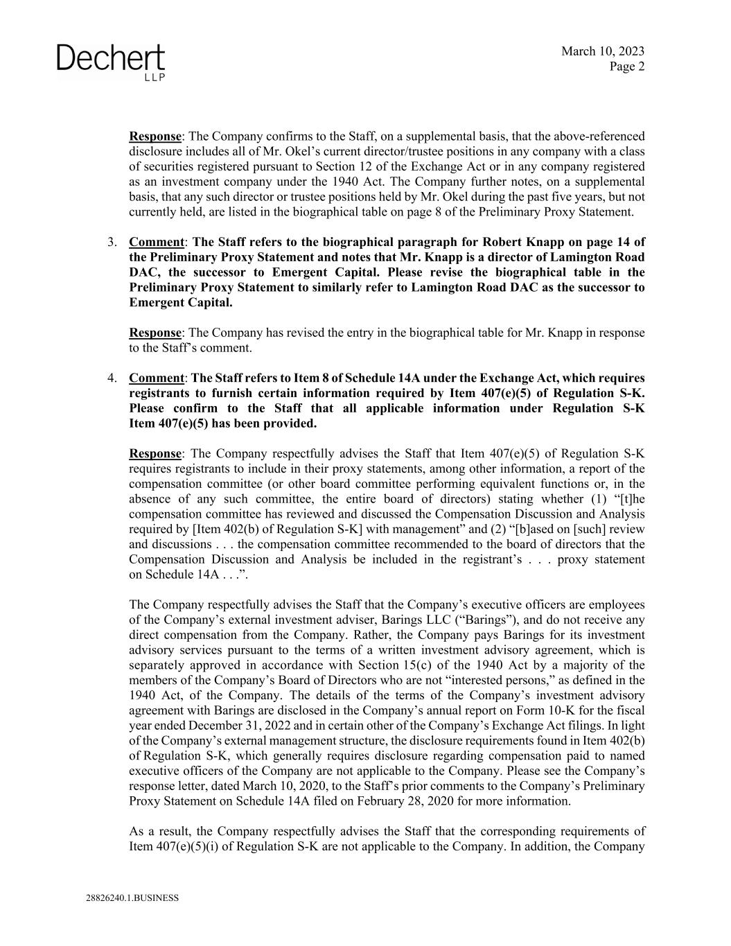 March 10, 2023 Page 2 28826240.1.BUSINESS Response: The Company confirms to the Staff, on a supplemental basis, that the above-referenced disclosure includes all of Mr. Okel’s current director/trustee positions in any company with a class of securities registered pursuant to Section 12 of the Exchange Act or in any company registered as an investment company under the 1940 Act. The Company further notes, on a supplemental basis, that any such director or trustee positions held by Mr. Okel during the past five years, but not currently held, are listed in the biographical table on page 8 of the Preliminary Proxy Statement. 3. Comment: The Staff refers to the biographical paragraph for Robert Knapp on page 14 of the Preliminary Proxy Statement and notes that Mr. Knapp is a director of Lamington Road DAC, the successor to Emergent Capital. Please revise the biographical table in the Preliminary Proxy Statement to similarly refer to Lamington Road DAC as the successor to Emergent Capital. Response: The Company has revised the entry in the biographical table for Mr. Knapp in response to the Staff’s comment. 4. Comment: The Staff refers to Item 8 of Schedule 14A under the Exchange Act, which requires registrants to furnish certain information required by Item 407(e)(5) of Regulation S-K. Please confirm to the Staff that all applicable information under Regulation S-K Item 407(e)(5) has been provided. Response: The Company respectfully advises the Staff that Item 407(e)(5) of Regulation S-K requires registrants to include in their proxy statements, among other information, a report of the compensation committee (or other board committee performing equivalent functions or, in the absence of any such committee, the entire board of directors) stating whether (1) “[t]he compensation committee has reviewed and discussed the Compensation Discussion and Analysis required by [Item 402(b) of Regulation S-K] with management” and (2) “[b]ased on [such] review and discussions . . . the compensation committee recommended to the board of directors that the Compensation Discussion and Analysis be included in the registrant’s . . . proxy statement on Schedule 14A . . .”. The Company respectfully advises the Staff that the Company’s executive officers are employees of the Company’s external investment adviser, Barings LLC (“Barings”), and do not receive any direct compensation from the Company. Rather, the Company pays Barings for its investment advisory services pursuant to the terms of a written investment advisory agreement, which is separately approved in accordance with Section 15(c) of the 1940 Act by a majority of the members of the Company’s Board of Directors who are not “interested persons,” as defined in the 1940 Act, of the Company. The details of the terms of the Company’s investment advisory agreement with Barings are disclosed in the Company’s annual report on Form 10-K for the fiscal year ended December 31, 2022 and in certain other of the Company’s Exchange Act filings. In light of the Company’s external management structure, the disclosure requirements found in Item 402(b) of Regulation S-K, which generally requires disclosure regarding compensation paid to named executive officers of the Company are not applicable to the Company. Please see the Company’s response letter, dated March 10, 2020, to the Staff’s prior comments to the Company’s Preliminary Proxy Statement on Schedule 14A filed on February 28, 2020 for more information. As a result, the Company respectfully advises the Staff that the corresponding requirements of Item 407(e)(5)(i) of Regulation S-K are not applicable to the Company. In addition, the Company