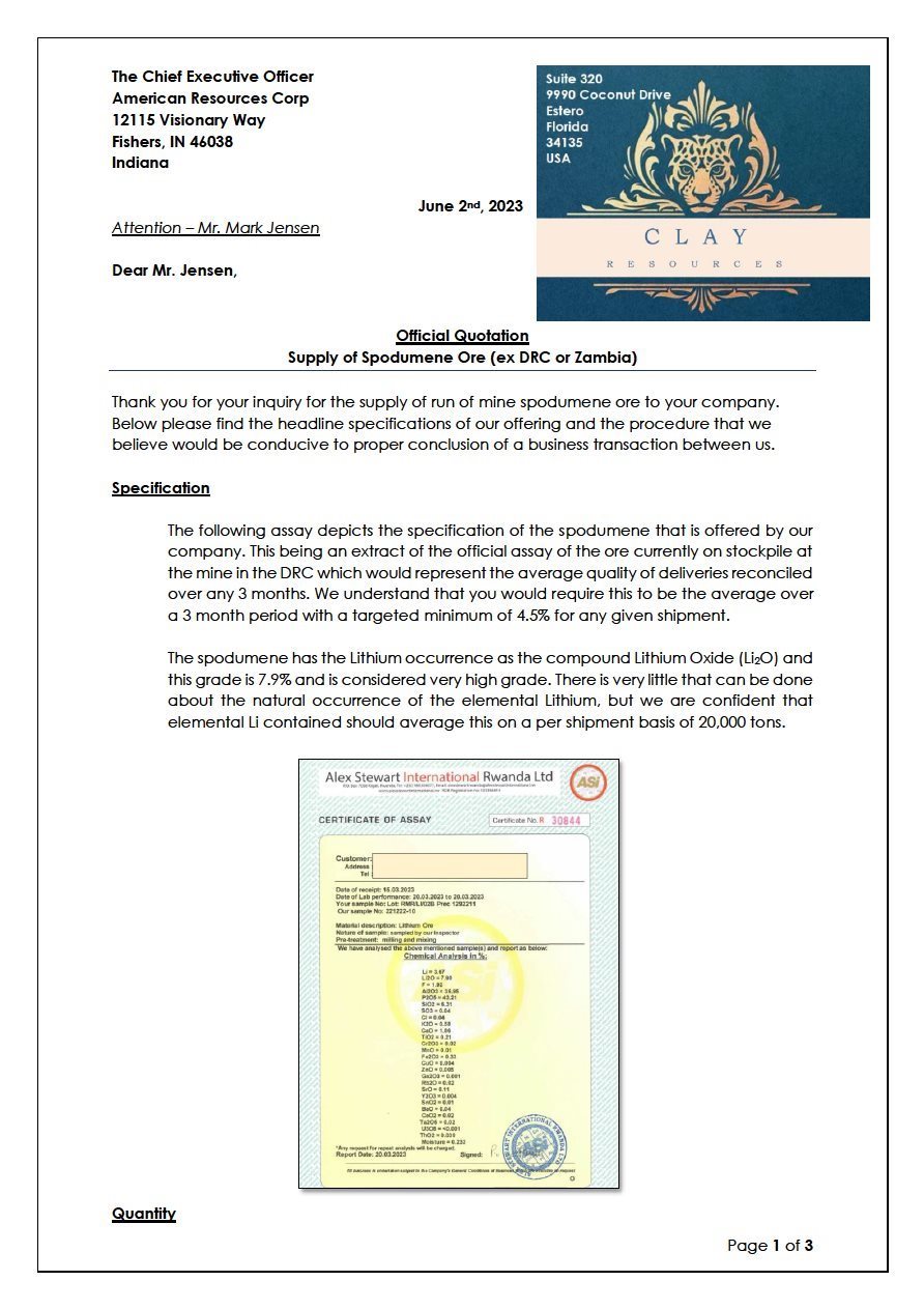 FISHERS, INDIANA / ACCESSWIRE / June 7, 2023 / American Resources Corporation (NASDAQ:AREC) (“American Resources” or the “Company”), a next generation and socially responsible supplier of rare earth and critical elements, carbon and advanced carbon materials, today announced that it has entered into the first stage of a South African partnership through the signing of an offtake agreement to purchase 6%+ lithium spodumene ores from a series of regional operating mining concessions to be refined to greater than 99.9% pure, battery-grade lithium carbonate or hydroxide using its wholly-owned ReElement Technologies’ patented refining and purification processes.