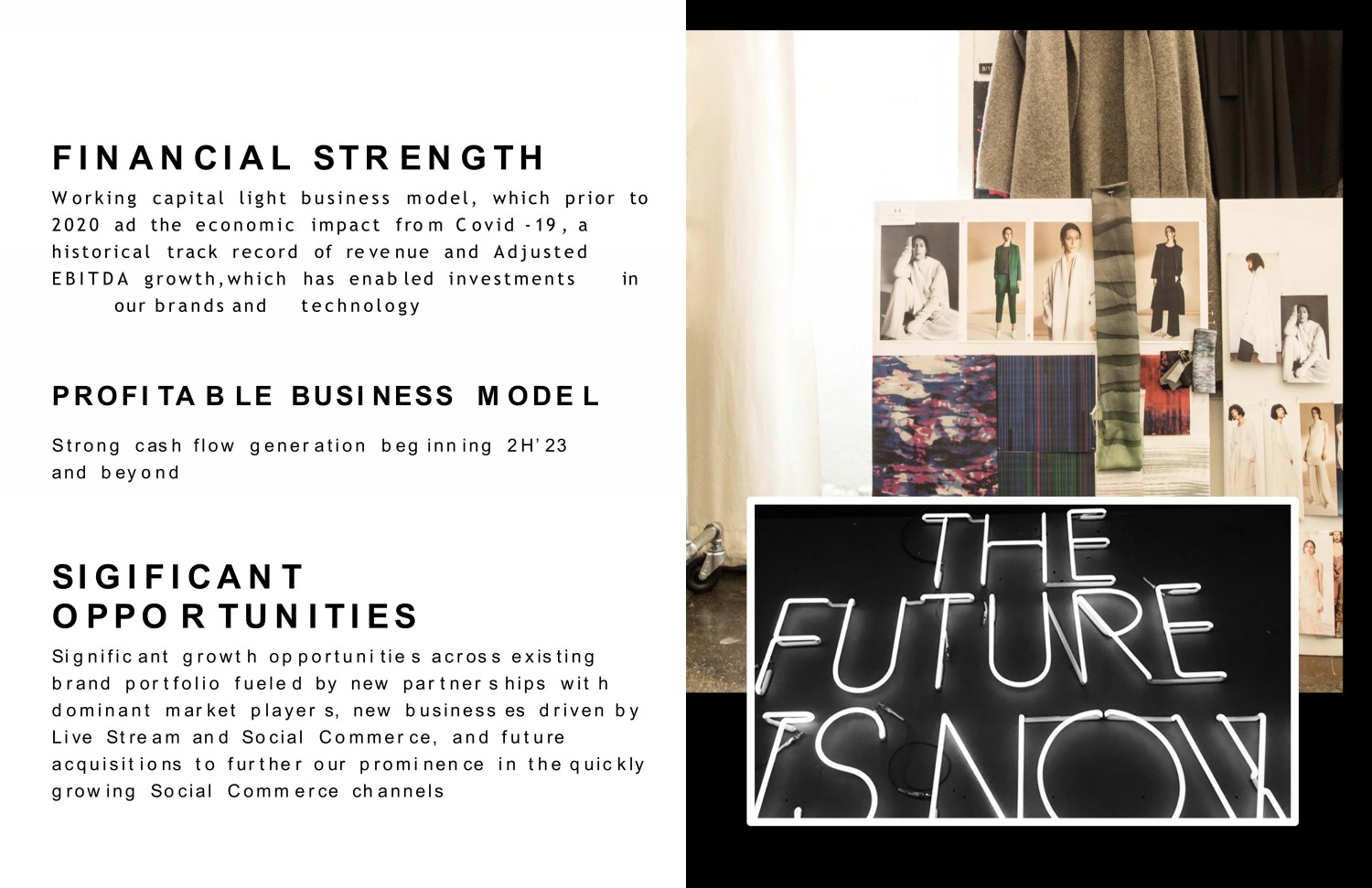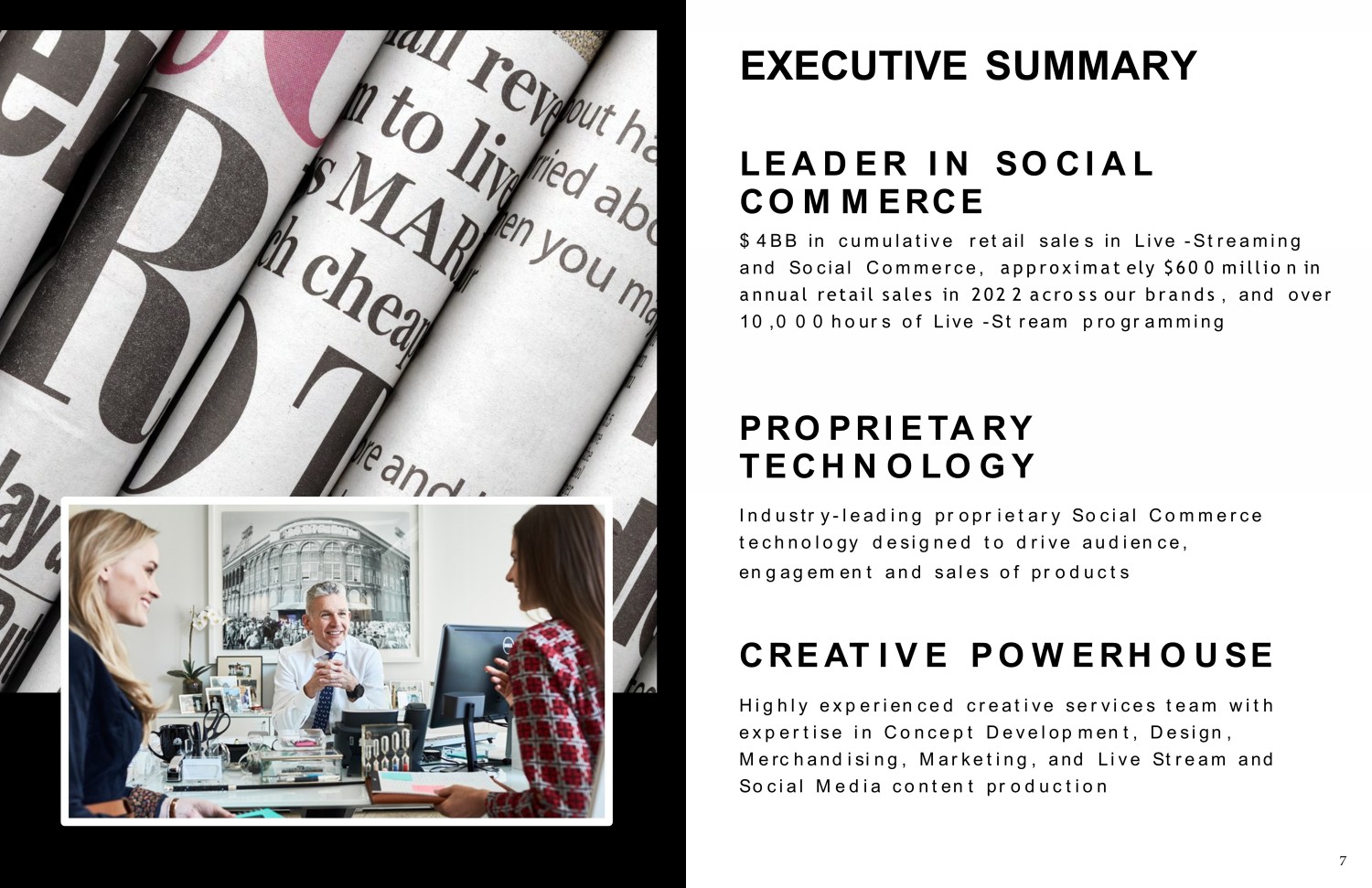 P R O P R I E TA R Y T E C H N O L O G Y I n d u s tr y - l e a d i n g pr opr i e t a r y S o c i a l C o m m e r c e t e c h n o l o gy d e s i g n e d t o d r i v e a u d i en c e , en g a g em en t a n d s a l e s o f pr o d u c t s C R E AT I V E P O W E R H O U S E H i g h l y e x p e r i en c e d c r e a t i v e s e r v i c e s t e a m w i t h e x p e r t i s e i n C o n c e p t D e v e l op m en t , D e s i gn , M e rc h a nd i si n g , M a r k e t i n g , a nd L i v e S t r e a m a nd S o c i a l M e d i a c o n t en t pr o d u c t i o n 7 EXECUTIVE SUMMARY L E A D E R I N S O C I A L C O M M E R C E $ 4 B B in cumulative r et ail sale s in L ive - S t reaming a nd S o cial Commerce, approximat ely $60 0 millio n in a nnual retail sales in 202 2 a cro s s our brands , and over 1 0 ,0 0 0 h o ur s o f L ive - S t r eam p ro gr amming
