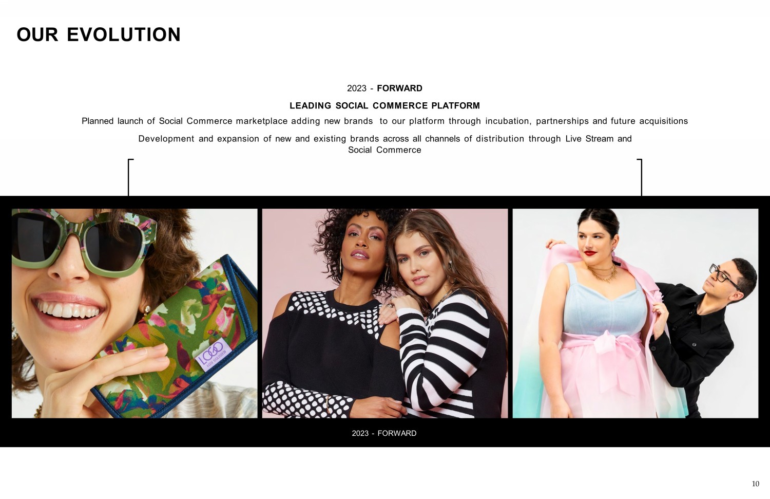 OUR EVOLUTION 10 2023 - FORWARD LEADING SOCIAL COMMERCE PLATFORM Planned launch of Social Commerce marketplace adding new brands to our platform through incubation, partnerships and future acquisitions Development and expansion of new and existing brands across all channels of distribution through Live Stream and Social Commerce 2023 - FORWARD