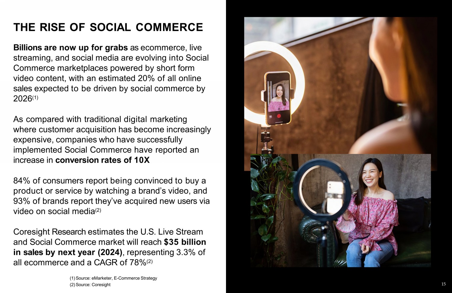 15 THE RISE OF SOCIAL COMMERCE Billions are now up for grabs as ecommerce, live streaming, and social media are evolving into Social Commerce marketplaces powered by short form video content, with an estimated 20% of all online sales expected to be driven by social commerce by 2026 (1) As compared with traditional digital marketing where customer acquisition has become increasingly expensive, companies who have successfully implemented Social Commerce have reported an increase in conversion rates of 10X 84% of consumers report being convinced to buy a product or service by watching a brand’s video, and 93% of brands report they’ve acquired new users via video on social media (2) Coresight Research estimates the U.S. Live Stream and Social Commerce market will reach $35 billion in sales by next year (2024) , representing 3.3% of all ecommerce and a CAGR of 78% (2) (1) Source: eMarketer, E - Commerce Strategy (2) Source: Coresight