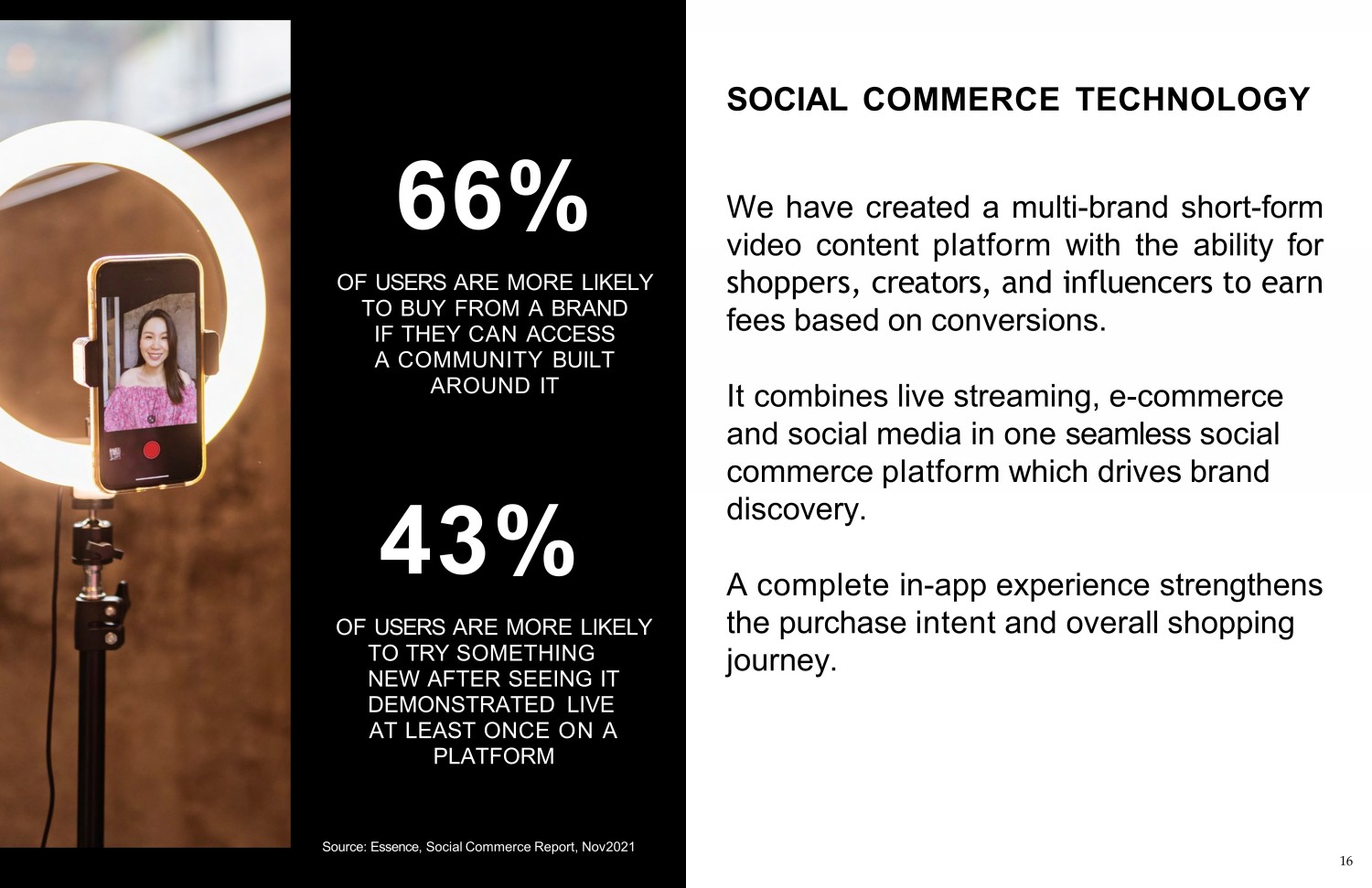 SOCIAL COMMERCE TECHNOLOGY We have created a multi - brand short - form video content platform with the ability for shoppers, creators, and influencers to earn fees based on conversions . It combines live streaming, e - commerce and social media in one seamless social commerce platform which drives brand discovery. A complete in - app experience strengthens the purchase intent and overall shopping journey. 66% OF USERS ARE MORE LIKELY TO BUY FROM A BRAND IF THEY CAN ACCESS A COMMUNITY BUILT AROUND IT 43% OF USERS ARE MORE LIKELY TO TRY SOMETHING NEW AFTER SEEING IT DEMONSTRATED LIVE AT LEAST ONCE ON A PLATFORM Source: Essence, Social Commerce Report, Nov2021 16