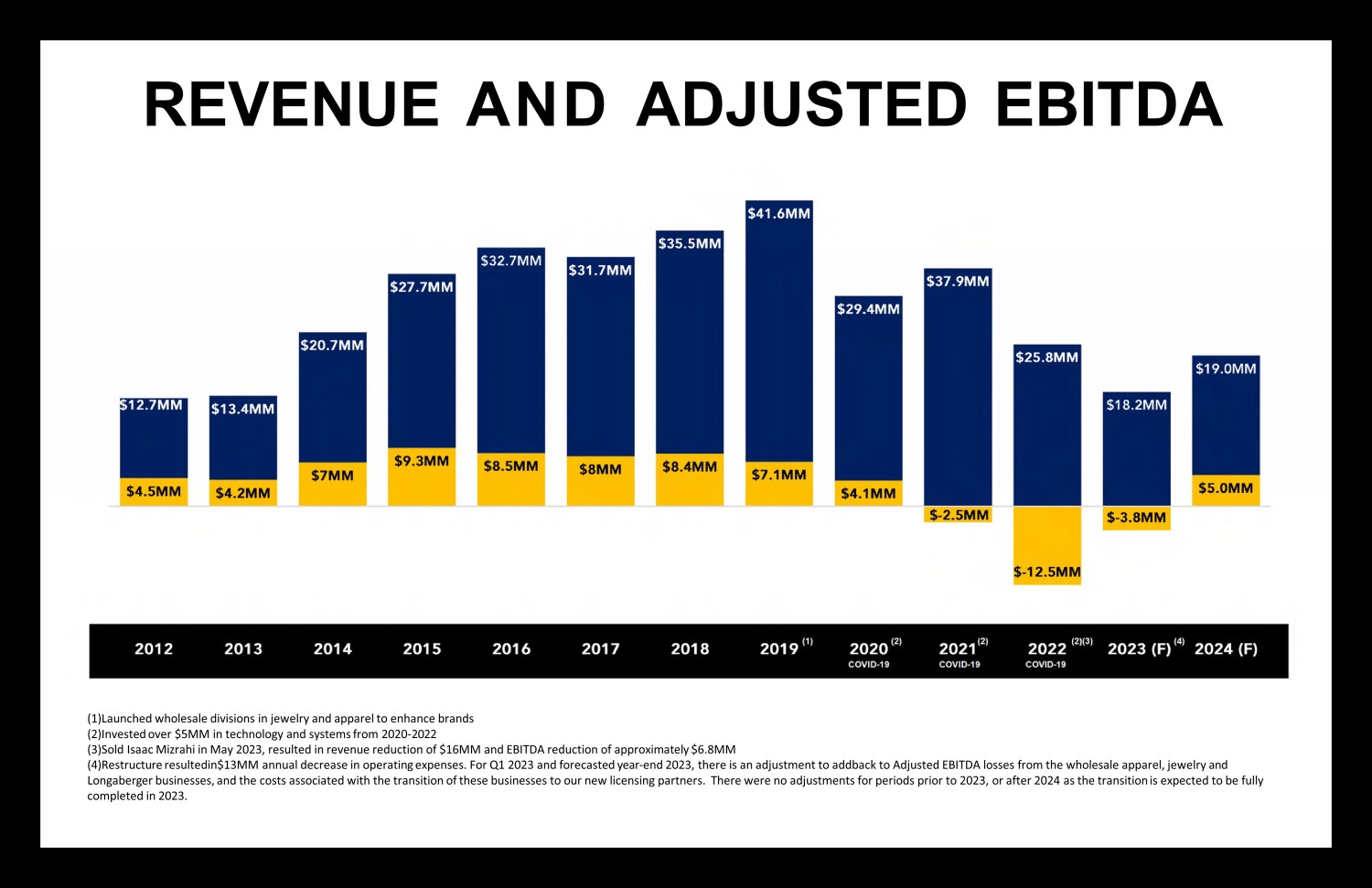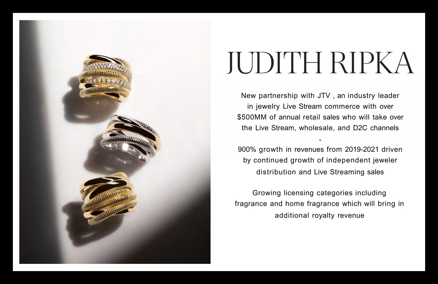 New partnership with JTV , an industry leader in jewelry Live Stream commerce with over $500MM of annual retail sales who will take over the Live Stream, wholesale, and D2C channels - 900% growth in revenues from 2019 - 2021 driven by continued growth of independent jeweler distribution and Live Streaming sales Growing licensing categories including fragrance and home fragrance which will bring in additional royalty revenue 20