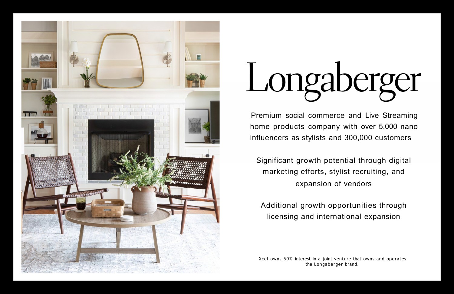 Premium social commerce and Live Streaming home products company with over 5 , 000 nano influencers as stylists and 300 , 000 customers Significant growth potential through digital marketing efforts, stylist recruiting, and expansion of vendors Additional growth opportunities through licensing and international expansion Xcel owns 50% interest in a joint venture that owns and operates the Longaberger brand. 24