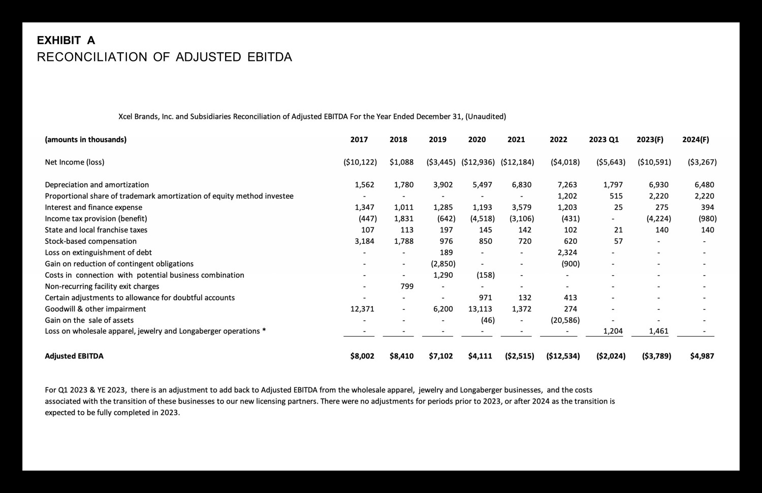 FORWARD LOOKING STATEMENTS Certain statements in this presentation, as well as certain oral statements made by management during the presentation, constitute “forward - looking statements” within the meaning of the United States Private Securities Litigation Reform Act of 1995. These statements include, without limitation, statements expressed or implied regarding our plans and milestones, plans to fund our current activities, statements concerning our strategic relationships and activities, strategy, future operations and expansion, future financial position, future sales and revenues, projected costs, and market penetration. In some cases, forward - looking statements can be identified by terminology such as “may, “will”, “should”, “expects”, “seeks”, “plans”, “goals”, “anticipates”, “believes”, “estimates”, “predicts”, “potential”, “projects”, “continue”, “intends”, “could”, “opportunity”, or negative of such terms or other comparable terminology. These forward looking statements include, but are not limited to statements regarding estimates and forecasts of financial and other performance metrics and market opportunities. These statements are based on the current expectations and forecasts of Xcel Brands, Inc’s management and are not predictions or guarantees of future performance. You should not place undue reliance on our forward - looking statements, which are subject to a multitude of known and unknown risks and uncertainties that could cause actual results, future circumstance or events to differ materially from those stated in or implied by the forward - looking statements. These risks and uncertainties include, but are not limited to, the ability of our licensees to produce, market and sell quality products bearing our brand names, continued market acceptance of our brands and any future brands we acquire, our ability to service our significant debt obligations, our ability to raise capital for any future acquisitions, concentration of a substantial portion of our licensing revenue from a limited number licensees, our dependence on QVC, restrictions in our agreements with QVC and other licensees on our ability to sell products with certain retailers, our dependence on promotional services of our spokesperson, limitations on our ownership of the H Halston brands, our ability to manage expected future growth, our ability to identify and acquire additional trademarks, competition for licensees, competition in our licensee’s markets, our ability to protect our intellectual property, our dependence on our CEO and other key executive officers, the success of our e - commerce strategy, supply chain disruptions, operating in high inflation environment and potential recession and other risks and uncertainties detailed from time to time in our public disclosure documents or other filings with the Securities and Exchange Commission. Additional risks and uncertainties relating to us, and our business can be found in the “Risk Factors” section of our latest annual report on Form 10 - K as well as in our other public filings. The forward - looking statements are made as of the date hereof, and we disclaim any intention and have no obligation or responsibility, except as required by law, to update or revise any forward - looking statements, whether as a result of new information, future events or otherwise. This Presentation contains projected financial information and goals with respect to Xcel Brands, Inc. Such projected financial information and goals constitute forward - looking information and is for illustrative purposes only and should not be relied upon as necessarily being indicative of future results. The assumptions and estimates underlying such financial forecast information are inherently uncertain and are subject to a wide variety of significant business, economic, competitive, and other risks and uncertainties that could cause actual results to differ materially from those contained in the prospective financial information. See “Forward - Looking Statements” above. Actual results may differ materially from the results contemplat - ed by the financial forecast information contained in this Presentation, and the inclusion of such information in this Presentation should not be regarded as a representation by any per - son that the results reflected in such forecasts will be achieved. NON - GAAP FINANCIAL MEASURES In addition to financial measures prepared in accordance with U.S. generally accepted accounting principles (GAAP), we use certain non - GAAP financial measures in this presentation. Adjusted EBITDA is a non - GAAP unaudited measure, which we define as net income (loss) attributable to Xcel Brands, Inc. stockholders before depreciation and amortization, proportional share of trademark amortization of equity method investee, interest and finance expenses (including loss on extinguishment of debt, if any), income taxes, other state and local franchise taxes, stock - based compensation and costs in connection with potential acquisitions certain adjustments to allowances for doubtful accounts, for account debtors that have filed for bankruptcy, property and equipment impairment, gain on sale of assets, loss on wholesale apparel, jewelry and Longaberger operations and gain on the reduction of contingent obligation. We use Adjusted EBITDA as a measure of operating performance to assist in comparing performance from period to period on a consistent basis and to identify business trends relating to Xcel’s results of operations. We believe Adjusted EBITDA is also useful because it provides supplemental information to assist investors in evaluating Xcel’s financial results. Adjusted EBITDA should not be considered in isolation or as an alternative to net income or any other measure of financial performance calculated and presented in accordance with GAAP. Given that Adjusted EBITDA is a financial