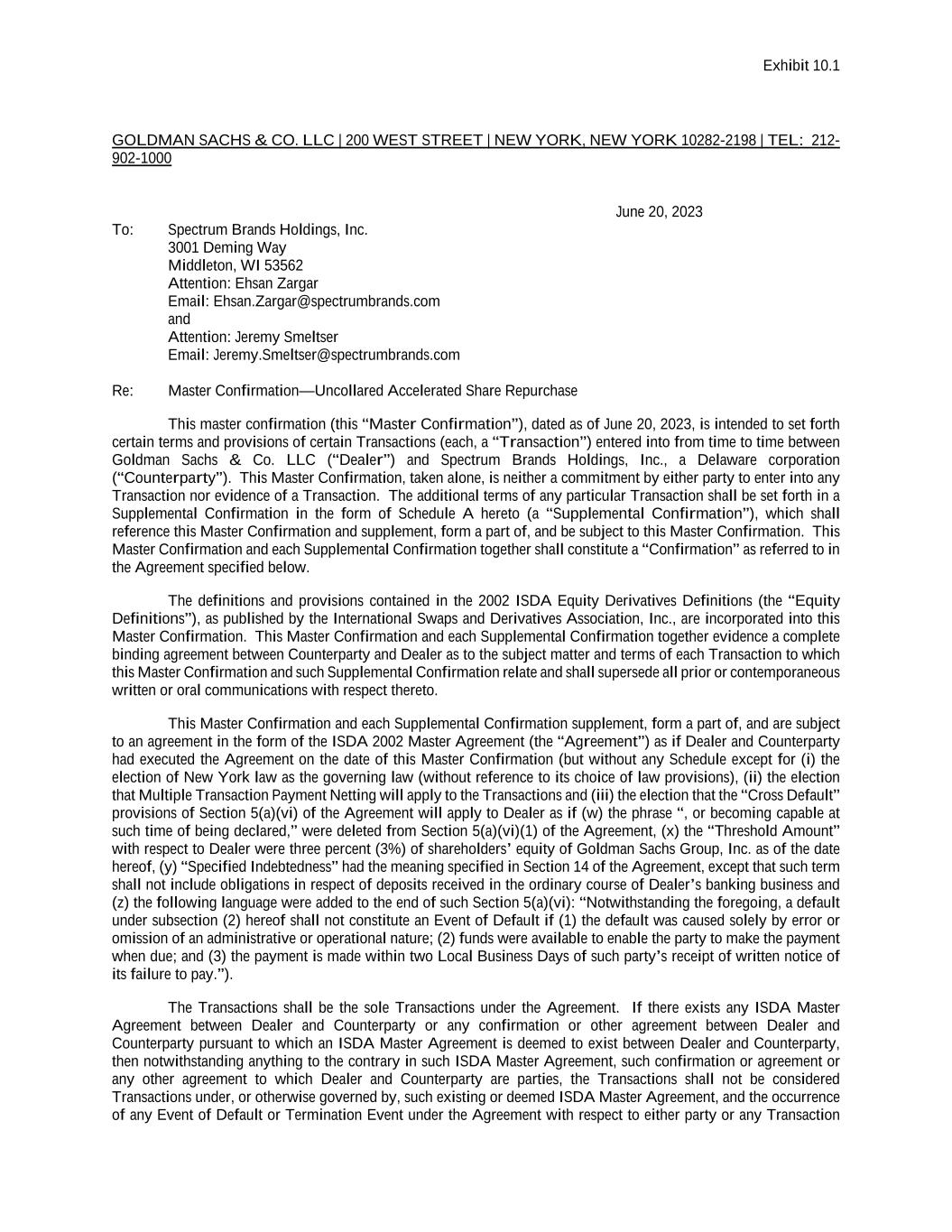 Exhibit 10.1 GOLDMAN SACHS & CO. LLC | 200 WEST STREET | NEW YORK, NEW YORK 10282-2198 | TEL: 212- 902-1000 June 20, 2023 To: Spectrum Brands Holdings, Inc. 3001 Deming Way Middleton, WI 53562 Attention: Ehsan Zargar Email: Ehsan.Zargar@spectrumbrands.com and Attention: Jeremy Smeltser Email: Jeremy.Smeltser@spectrumbrands.com Re: Master Confirmation—Uncollared Accelerated Share Repurchase This master confirmation (this “Master Confirmation”), dated as of June 20, 2023, is intended to set forth certain terms and provisions of certain Transactions (each, a “Transaction”) entered into from time to time between Goldman Sachs & Co. LLC (“Dealer”) and Spectrum Brands Holdings, Inc., a Delaware corporation (“Counterparty”). This Master Confirmation, taken alone, is neither a commitment by either party to enter into any Transaction nor evidence of a Transaction. The additional terms of any particular Transaction shall be set forth in a Supplemental Confirmation in the form of Schedule A hereto (a “Supplemental Confirmation”), which shall reference this Master Confirmation and supplement, form a part of, and be subject to this Master Confirmation. This Master Confirmation and each Supplemental Confirmation together shall constitute a “Confirmation” as referred to in the Agreement specified below. The definitions and provisions contained in the 2002 ISDA Equity Derivatives Definitions (the “Equity Definitions”), as published by the International Swaps and Derivatives Association, Inc., are incorporated into this Master Confirmation. This Master Confirmation and each Supplemental Confirmation together evidence a complete binding agreement between Counterparty and Dealer as to the subject matter and terms of each Transaction to which this Master Confirmation and such Supplemental Confirmation relate and shall supersede all prior or contemporaneous written or oral communications with respect thereto. This Master Confirmation and each Supplemental Confirmation supplement, form a part of, and are subject to an agreement in the form of the ISDA 2002 Master Agreement (the “Agreement”) as if Dealer and Counterparty had executed the Agreement on the date of this Master Confirmation (but without any Schedule except for (i) the election of New York law as the governing law (without reference to its choice of law provisions), (ii) the election that Multiple Transaction Payment Netting will apply to the Transactions and (iii) the election that the “Cross Default” provisions of Section 5(a)(vi) of the Agreement will apply to Dealer as if (w) the phrase “, or becoming capable at such time of being declared,” were deleted from Section 5(a)(vi)(1) of the Agreement, (x) the “Threshold Amount” with respect to Dealer were three percent (3%) of shareholders’ equity of Goldman Sachs Group, Inc. as of the date hereof, (y) “Specified Indebtedness” had the meaning specified in Section 14 of the Agreement, except that such term shall not include obligations in respect of deposits received in the ordinary course of Dealer’s banking business and (z) the following language were added to the end of such Section 5(a)(vi): “Notwithstanding the foregoing, a default under subsection (2) hereof shall not constitute an Event of Default if (1) the default was caused solely by error or omission of an administrative or operational nature; (2) funds were available to enable the party to make the payment when due; and (3) the payment is made within two Local Business Days of such party’s receipt of written notice of its failure to pay.”). The Transactions shall be the sole Transactions under the Agreement. If there exists any ISDA Master Agreement between Dealer and Counterparty or any confirmation or other agreement between Dealer and Counterparty pursuant to which an ISDA Master Agreement is deemed to exist between Dealer and Counterparty, then notwithstanding anything to the contrary in such ISDA Master Agreement, such confirmation or agreement or any other agreement to which Dealer and Counterparty are parties, the Transactions shall not be considered Transactions under, or otherwise governed by, such existing or deemed ISDA Master Agreement, and the occurrence of any Event of Default or Termination Event under the Agreement with respect to either party or any Transaction