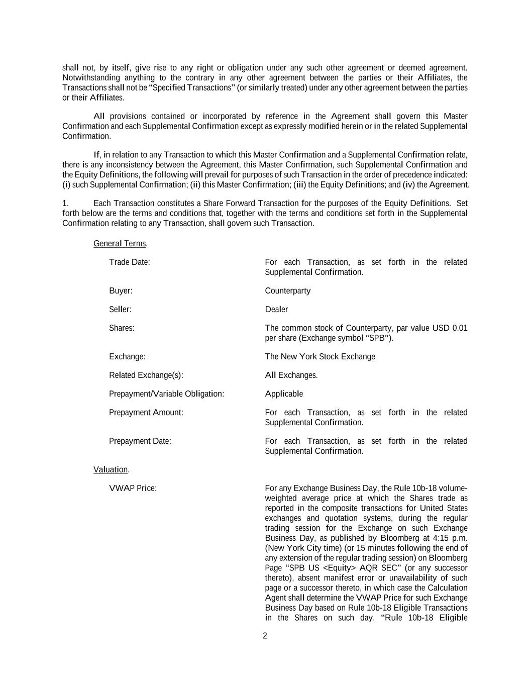 2 shall not, by itself, give rise to any right or obligation under any such other agreement or deemed agreement. Notwithstanding anything to the contrary in any other agreement between the parties or their Affiliates, the Transactions shall not be “Specified Transactions” (or similarly treated) under any other agreement between the parties or their Affiliates. All provisions contained or incorporated by reference in the Agreement shall govern this Master Confirmation and each Supplemental Confirmation except as expressly modified herein or in the related Supplemental Confirmation. If, in relation to any Transaction to which this Master Confirmation and a Supplemental Confirmation relate, there is any inconsistency between the Agreement, this Master Confirmation, such Supplemental Confirmation and the Equity Definitions, the following will prevail for purposes of such Transaction in the order of precedence indicated: (i) such Supplemental Confirmation; (ii) this Master Confirmation; (iii) the Equity Definitions; and (iv) the Agreement. 1. Each Transaction constitutes a Share Forward Transaction for the purposes of the Equity Definitions. Set forth below are the terms and conditions that, together with the terms and conditions set forth in the Supplemental Confirmation relating to any Transaction, shall govern such Transaction. General Terms. Trade Date: For each Transaction, as set forth in the related Supplemental Confirmation. Buyer: Counterparty Seller: Dealer Shares: The common stock of Counterparty, par value USD 0.01 per share (Exchange symbol “SPB”). Exchange: The New York Stock Exchange Related Exchange(s): All Exchanges. Prepayment/Variable Obligation: Applicable Prepayment Amount: For each Transaction, as set forth in the related Supplemental Confirmation. Prepayment Date: For each Transaction, as set forth in the related Supplemental Confirmation. Valuation. VWAP Price: For any Exchange Business Day, the Rule 10b-18 volume- weighted average price at which the Shares trade as reported in the composite transactions for United States exchanges and quotation systems, during the regular trading session for the Exchange on such Exchange Business Day, as published by Bloomberg at 4:15 p.m. (New York City time) (or 15 minutes following the end of any extension of the regular trading session) on Bloomberg Page “SPB US <Equity> AQR SEC” (or any successor thereto), absent manifest error or unavailability of such page or a successor thereto, in which case the Calculation Agent shall determine the VWAP Price for such Exchange Business Day based on Rule 10b-18 Eligible Transactions in the Shares on such day. “Rule 10b-18 Eligible