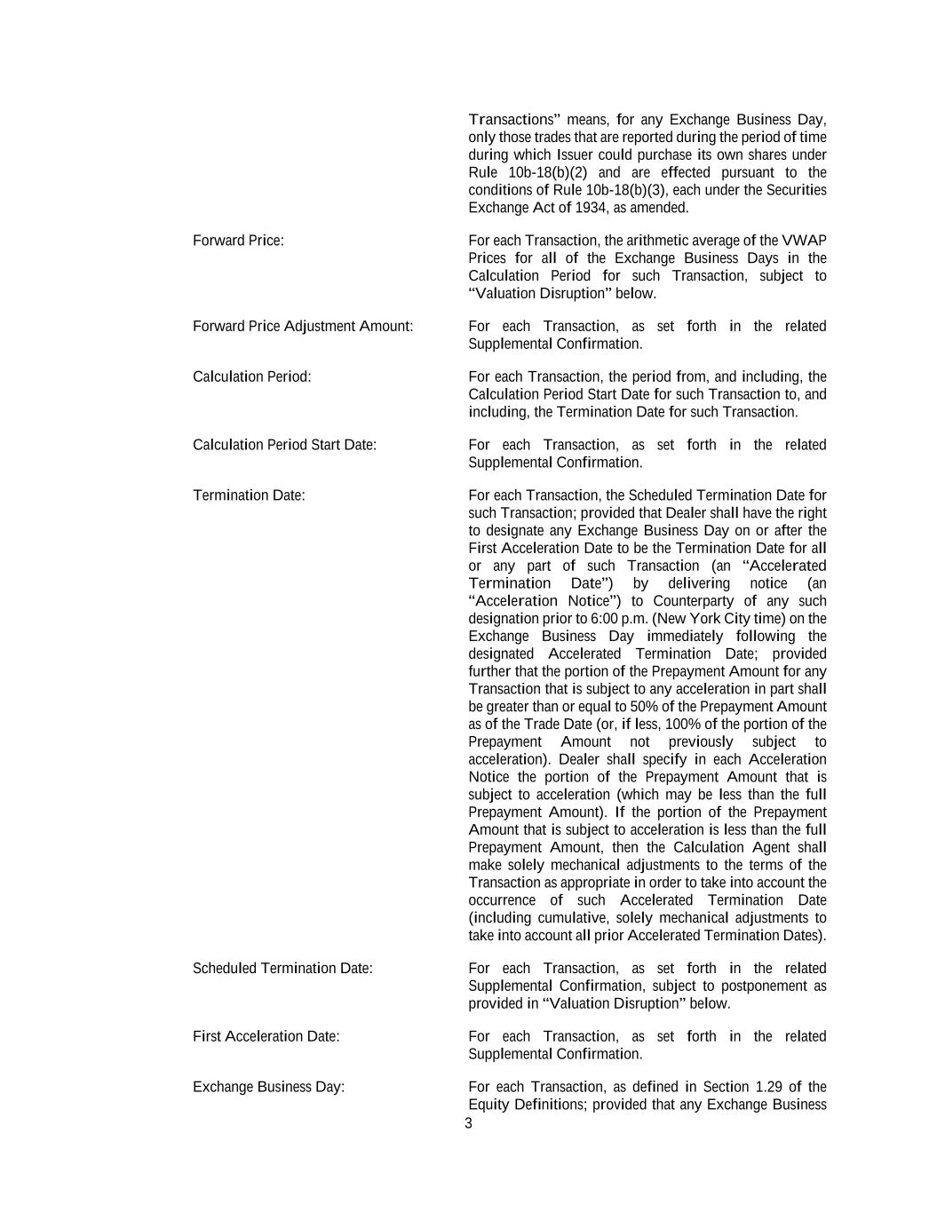 3 Transactions” means, for any Exchange Business Day, only those trades that are reported during the period of time during which Issuer could purchase its own shares under Rule 10b-18(b)(2) and are effected pursuant to the conditions of Rule 10b-18(b)(3), each under the Securities Exchange Act of 1934, as amended. Forward Price: For each Transaction, the arithmetic average of the VWAP Prices for all of the Exchange Business Days in the Calculation Period for such Transaction, subject to “Valuation Disruption” below. Forward Price Adjustment Amount: For each Transaction, as set forth in the related Supplemental Confirmation. Calculation Period: For each Transaction, the period from, and including, the Calculation Period Start Date for such Transaction to, and including, the Termination Date for such Transaction. Calculation Period Start Date: For each Transaction, as set forth in the related Supplemental Confirmation. Termination Date: For each Transaction, the Scheduled Termination Date for such Transaction; provided that Dealer shall have the right to designate any Exchange Business Day on or after the First Acceleration Date to be the Termination Date for all or any part of such Transaction (an “Accelerated Termination Date”) by delivering notice (an “Acceleration Notice”) to Counterparty of any such designation prior to 6:00 p.m. (New York City time) on the Exchange Business Day immediately following the designated Accelerated Termination Date; provided further that the portion of the Prepayment Amount for any Transaction that is subject to any acceleration in part shall be greater than or equal to 50% of the Prepayment Amount as of the Trade Date (or, if less, 100% of the portion of the Prepayment Amount not previously subject to acceleration). Dealer shall specify in each Acceleration Notice the portion of the Prepayment Amount that is subject to acceleration (which may be less than the full Prepayment Amount). If the portion of the Prepayment Amount that is subject to acceleration is less than the full Prepayment Amount, then the Calculation Agent shall make solely mechanical adjustments to the terms of the Transaction as appropriate in order to take into account the occurrence of such Accelerated Termination Date (including cumulative, solely mechanical adjustments to take into account all prior Accelerated Termination Dates). Scheduled Termination Date: For each Transaction, as set forth in the related Supplemental Confirmation, subject to postponement as provided in “Valuation Disruption” below. First Acceleration Date: For each Transaction, as set forth in the related Supplemental Confirmation. Exchange Business Day: For each Transaction, as defined in Section 1.29 of the Equity Definitions; provided that any Exchange Business