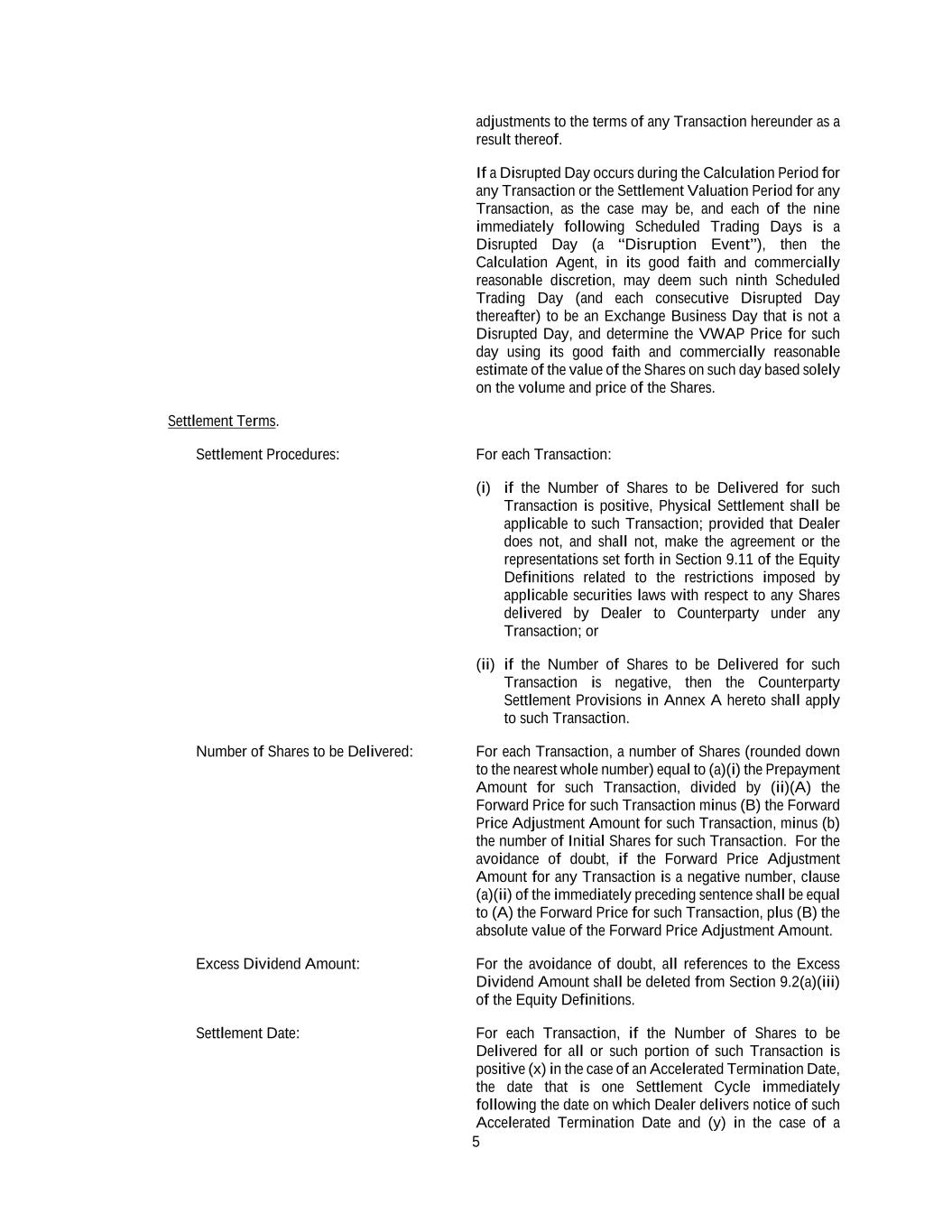 5 adjustments to the terms of any Transaction hereunder as a result thereof. If a Disrupted Day occurs during the Calculation Period for any Transaction or the Settlement Valuation Period for any Transaction, as the case may be, and each of the nine immediately following Scheduled Trading Days is a Disrupted Day (a “Disruption Event”), then the Calculation Agent, in its good faith and commercially reasonable discretion, may deem such ninth Scheduled Trading Day (and each consecutive Disrupted Day thereafter) to be an Exchange Business Day that is not a Disrupted Day, and determine the VWAP Price for such day using its good faith and commercially reasonable estimate of the value of the Shares on such day based solely on the volume and price of the Shares. Settlement Terms. Settlement Procedures: For each Transaction: (i) if the Number of Shares to be Delivered for such Transaction is positive, Physical Settlement shall be applicable to such Transaction; provided that Dealer does not, and shall not, make the agreement or the representations set forth in Section 9.11 of the Equity Definitions related to the restrictions imposed by applicable securities laws with respect to any Shares delivered by Dealer to Counterparty under any Transaction; or (ii) if the Number of Shares to be Delivered for such Transaction is negative, then the Counterparty Settlement Provisions in Annex A hereto shall apply to such Transaction. Number of Shares to be Delivered: For each Transaction, a number of Shares (rounded down to the nearest whole number) equal to (a)(i) the Prepayment Amount for such Transaction, divided by (ii)(A) the Forward Price for such Transaction minus (B) the Forward Price Adjustment Amount for such Transaction, minus (b) the number of Initial Shares for such Transaction. For the avoidance of doubt, if the Forward Price Adjustment Amount for any Transaction is a negative number, clause (a)(ii) of the immediately preceding sentence shall be equal to (A) the Forward Price for such Transaction, plus (B) the absolute value of the Forward Price Adjustment Amount. Excess Dividend Amount: For the avoidance of doubt, all references to the Excess Dividend Amount shall be deleted from Section 9.2(a)(iii) of the Equity Definitions. Settlement Date: For each Transaction, if the Number of Shares to be Delivered for all or such portion of such Transaction is positive (x) in the case of an Accelerated Termination Date, the date that is one Settlement Cycle immediately following the date on which Dealer delivers notice of such Accelerated Termination Date and (y) in the case of a