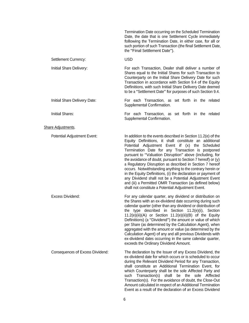 6 Termination Date occurring on the Scheduled Termination Date, the date that is one Settlement Cycle immediately following the Termination Date, in either case, for all or such portion of such Transaction (the final Settlement Date, the “Final Settlement Date”). Settlement Currency: USD Initial Share Delivery: For each Transaction, Dealer shall deliver a number of Shares equal to the Initial Shares for such Transaction to Counterparty on the Initial Share Delivery Date for such Transaction in accordance with Section 9.4 of the Equity Definitions, with such Initial Share Delivery Date deemed to be a “Settlement Date” for purposes of such Section 9.4. Initial Share Delivery Date: For each Transaction, as set forth in the related Supplemental Confirmation. Initial Shares: For each Transaction, as set forth in the related Supplemental Confirmation. Share Adjustments. Potential Adjustment Event: In addition to the events described in Section 11.2(e) of the Equity Definitions, it shall constitute an additional Potential Adjustment Event if (x) the Scheduled Termination Date for any Transaction is postponed pursuant to “Valuation Disruption” above (including, for the avoidance of doubt, pursuant to Section 7 hereof) or (y) a Regulatory Disruption as described in Section 7 hereof occurs. Notwithstanding anything to the contrary herein or in the Equity Definitions, (i) the declaration or payment of any Dividend shall not be a Potential Adjustment Event and (ii) a Permitted OMR Transaction (as defined below) shall not constitute a Potential Adjustment Event. Excess Dividend: For any calendar quarter, any dividend or distribution on the Shares with an ex-dividend date occurring during such calendar quarter (other than any dividend or distribution of the type described in Section 11.2(e)(i), Section 11.2(e)(ii)(A) or Section 11.2(e)(ii)(B) of the Equity Definitions) (a “Dividend”) the amount or value of which per Share (as determined by the Calculation Agent), when aggregated with the amount or value (as determined by the Calculation Agent) of any and all previous Dividends with ex-dividend dates occurring in the same calendar quarter, exceeds the Ordinary Dividend Amount. Consequences of Excess Dividend: The declaration by the Issuer of any Excess Dividend, the ex-dividend date for which occurs or is scheduled to occur during the Relevant Dividend Period for any Transaction, shall constitute an Additional Termination Event, for which Counterparty shall be the sole Affected Party and such Transaction(s) shall be the sole Affected Transaction(s). For the avoidance of doubt, the Close-Out Amount calculated in respect of an Additional Termination Event as a result of the declaration of an Excess Dividend