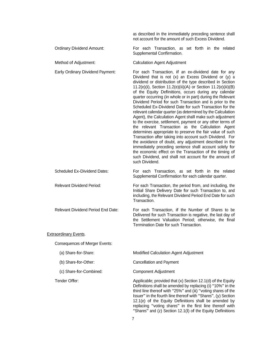 7 as described in the immediately preceding sentence shall not account for the amount of such Excess Dividend. Ordinary Dividend Amount: For each Transaction, as set forth in the related Supplemental Confirmation. Method of Adjustment: Calculation Agent Adjustment Early Ordinary Dividend Payment: For each Transaction, if an ex-dividend date for any Dividend that is not (x) an Excess Dividend or (y) a dividend or distribution of the type described in Section 11.2(e)(i), Section 11.2(e)(ii)(A) or Section 11.2(e)(ii)(B) of the Equity Definitions, occurs during any calendar quarter occurring (in whole or in part) during the Relevant Dividend Period for such Transaction and is prior to the Scheduled Ex-Dividend Date for such Transaction for the relevant calendar quarter (as determined by the Calculation Agent), the Calculation Agent shall make such adjustment to the exercise, settlement, payment or any other terms of the relevant Transaction as the Calculation Agent determines appropriate to preserve the fair value of such Transaction after taking into account such Dividend. For the avoidance of doubt, any adjustment described in the immediately preceding sentence shall account solely for the economic effect on the Transaction of the timing of such Dividend, and shall not account for the amount of such Dividend. Scheduled Ex-Dividend Dates: For each Transaction, as set forth in the related Supplemental Confirmation for each calendar quarter. Relevant Dividend Period: For each Transaction, the period from, and including, the Initial Share Delivery Date for such Transaction to, and including, the Relevant Dividend Period End Date for such Transaction. Relevant Dividend Period End Date: For each Transaction, if the Number of Shares to be Delivered for such Transaction is negative, the last day of the Settlement Valuation Period; otherwise, the final Termination Date for such Transaction. Extraordinary Events. Consequences of Merger Events: (a) Share-for-Share: Modified Calculation Agent Adjustment (b) Share-for-Other: Cancellation and Payment (c) Share-for-Combined: Component Adjustment Tender Offer: Applicable; provided that (x) Section 12.1(d) of the Equity Definitions shall be amended by replacing (i) “10%” in the third line thereof with “25%” and (ii) “voting shares of the Issuer” in the fourth line thereof with “Shares”, (y) Section 12.1(e) of the Equity Definitions shall be amended by replacing “voting shares” in the first line thereof with “Shares” and (z) Section 12.1(l) of the Equity Definitions