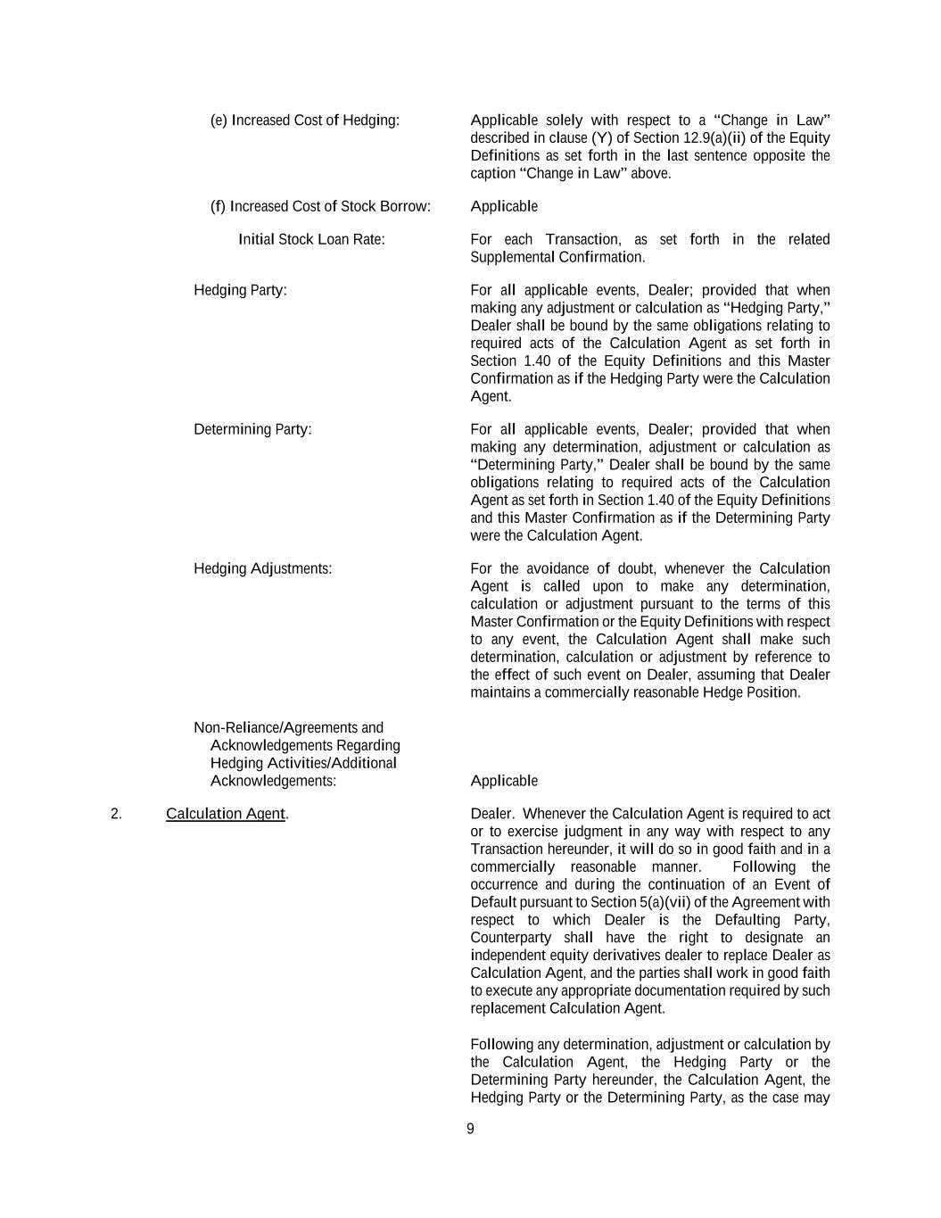 9 (e) Increased Cost of Hedging: Applicable solely with respect to a “Change in Law” described in clause (Y) of Section 12.9(a)(ii) of the Equity Definitions as set forth in the last sentence opposite the caption “Change in Law” above. (f) Increased Cost of Stock Borrow: Applicable Initial Stock Loan Rate: For each Transaction, as set forth in the related Supplemental Confirmation. Hedging Party: For all applicable events, Dealer; provided that when making any adjustment or calculation as “Hedging Party,” Dealer shall be bound by the same obligations relating to required acts of the Calculation Agent as set forth in Section 1.40 of the Equity Definitions and this Master Confirmation as if the Hedging Party were the Calculation Agent. Determining Party: For all applicable events, Dealer; provided that when making any determination, adjustment or calculation as “Determining Party,” Dealer shall be bound by the same obligations relating to required acts of the Calculation Agent as set forth in Section 1.40 of the Equity Definitions and this Master Confirmation as if the Determining Party were the Calculation Agent. Hedging Adjustments: For the avoidance of doubt, whenever the Calculation Agent is called upon to make any determination, calculation or adjustment pursuant to the terms of this Master Confirmation or the Equity Definitions with respect to any event, the Calculation Agent shall make such determination, calculation or adjustment by reference to the effect of such event on Dealer, assuming that Dealer maintains a commercially reasonable Hedge Position. Non-Reliance/Agreements and Acknowledgements Regarding Hedging Activities/Additional Acknowledgements: Applicable 2. Calculation Agent. Dealer. Whenever the Calculation Agent is required to act or to exercise judgment in any way with respect to any Transaction hereunder, it will do so in good faith and in a commercially reasonable manner. Following the occurrence and during the continuation of an Event of Default pursuant to Section 5(a)(vii) of the Agreement with respect to which Dealer is the Defaulting Party, Counterparty shall have the right to designate an independent equity derivatives dealer to replace Dealer as Calculation Agent, and the parties shall work in good faith to execute any appropriate documentation required by such replacement Calculation Agent. Following any determination, adjustment or calculation by the Calculation Agent, the Hedging Party or the Determining Party hereunder, the Calculation Agent, the Hedging Party or the Determining Party, as the case may