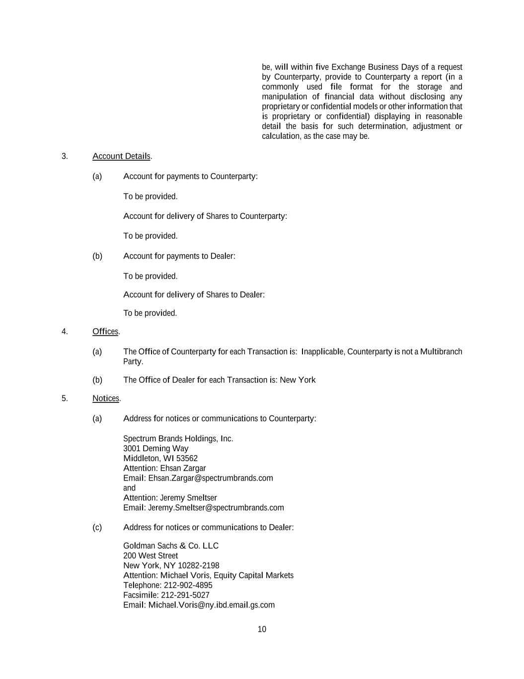 10 be, will within five Exchange Business Days of a request by Counterparty, provide to Counterparty a report (in a commonly used file format for the storage and manipulation of financial data without disclosing any proprietary or confidential models or other information that is proprietary or confidential) displaying in reasonable detail the basis for such determination, adjustment or calculation, as the case may be. 3. Account Details. (a) Account for payments to Counterparty: To be provided. Account for delivery of Shares to Counterparty: To be provided. (b) Account for payments to Dealer: To be provided. Account for delivery of Shares to Dealer: To be provided. 4. Offices. (a) The Office of Counterparty for each Transaction is: Inapplicable, Counterparty is not a Multibranch Party. (b) The Office of Dealer for each Transaction is: New York 5. Notices. (a) Address for notices or communications to Counterparty: Spectrum Brands Holdings, Inc. 3001 Deming Way Middleton, WI 53562 Attention: Ehsan Zargar Email: Ehsan.Zargar@spectrumbrands.com and Attention: Jeremy Smeltser Email: Jeremy.Smeltser@spectrumbrands.com (c) Address for notices or communications to Dealer: Goldman Sachs & Co. LLC 200 West Street New York, NY 10282-2198 Attention: Michael Voris, Equity Capital Markets Telephone: 212-902-4895 Facsimile: 212-291-5027 Email: Michael.Voris@ny.ibd.email.gs.com