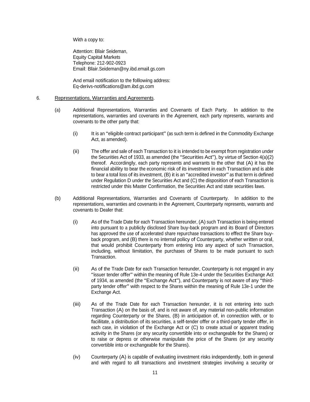 11 With a copy to: Attention: Blair Seideman, Equity Capital Markets Telephone: 212-902-0923 Email: Blair.Seideman@ny.ibd.email.gs.com And email notification to the following address: Eq-derivs-notifications@am.ibd.gs.com 6. Representations, Warranties and Agreements. (a) Additional Representations, Warranties and Covenants of Each Party. In addition to the representations, warranties and covenants in the Agreement, each party represents, warrants and covenants to the other party that: (i) It is an “eligible contract participant” (as such term is defined in the Commodity Exchange Act, as amended). (ii) The offer and sale of each Transaction to it is intended to be exempt from registration under the Securities Act of 1933, as amended (the “Securities Act”), by virtue of Section 4(a)(2) thereof. Accordingly, each party represents and warrants to the other that (A) it has the financial ability to bear the economic risk of its investment in each Transaction and is able to bear a total loss of its investment, (B) it is an “accredited investor” as that term is defined under Regulation D under the Securities Act and (C) the disposition of each Transaction is restricted under this Master Confirmation, the Securities Act and state securities laws. (b) Additional Representations, Warranties and Covenants of Counterparty. In addition to the representations, warranties and covenants in the Agreement, Counterparty represents, warrants and covenants to Dealer that: (i) As of the Trade Date for each Transaction hereunder, (A) such Transaction is being entered into pursuant to a publicly disclosed Share buy-back program and its Board of Directors has approved the use of accelerated share repurchase transactions to effect the Share buy- back program, and (B) there is no internal policy of Counterparty, whether written or oral, that would prohibit Counterparty from entering into any aspect of such Transaction, including, without limitation, the purchases of Shares to be made pursuant to such Transaction. (ii) As of the Trade Date for each Transaction hereunder, Counterparty is not engaged in any “issuer tender offer” within the meaning of Rule 13e-4 under the Securities Exchange Act of 1934, as amended (the “Exchange Act”), and Counterparty is not aware of any “third- party tender offer” with respect to the Shares within the meaning of Rule 13e-1 under the Exchange Act. (iii) As of the Trade Date for each Transaction hereunder, it is not entering into such Transaction (A) on the basis of, and is not aware of, any material non-public information regarding Counterparty or the Shares, (B) in anticipation of, in connection with, or to facilitate, a distribution of its securities, a self-tender offer or a third-party tender offer, in each case, in violation of the Exchange Act or (C) to create actual or apparent trading activity in the Shares (or any security convertible into or exchangeable for the Shares) or to raise or depress or otherwise manipulate the price of the Shares (or any security convertible into or exchangeable for the Shares). (iv) Counterparty (A) is capable of evaluating investment risks independently, both in general and with regard to all transactions and investment strategies involving a security or