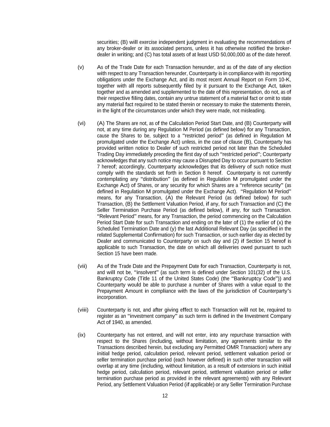 12 securities; (B) will exercise independent judgment in evaluating the recommendations of any broker-dealer or its associated persons, unless it has otherwise notified the broker- dealer in writing; and (C) has total assets of at least USD 50,000,000 as of the date hereof. (v) As of the Trade Date for each Transaction hereunder, and as of the date of any election with respect to any Transaction hereunder, Counterparty is in compliance with its reporting obligations under the Exchange Act, and its most recent Annual Report on Form 10-K, together with all reports subsequently filed by it pursuant to the Exchange Act, taken together and as amended and supplemented to the date of this representation, do not, as of their respective filing dates, contain any untrue statement of a material fact or omit to state any material fact required to be stated therein or necessary to make the statements therein, in the light of the circumstances under which they were made, not misleading. (vi) (A) The Shares are not, as of the Calculation Period Start Date, and (B) Counterparty will not, at any time during any Regulation M Period (as defined below) for any Transaction, cause the Shares to be, subject to a “restricted period” (as defined in Regulation M promulgated under the Exchange Act) unless, in the case of clause (B), Counterparty has provided written notice to Dealer of such restricted period not later than the Scheduled Trading Day immediately preceding the first day of such “restricted period”; Counterparty acknowledges that any such notice may cause a Disrupted Day to occur pursuant to Section 7 hereof; accordingly, Counterparty acknowledges that its delivery of such notice must comply with the standards set forth in Section 8 hereof. Counterparty is not currently contemplating any “distribution” (as defined in Regulation M promulgated under the Exchange Act) of Shares, or any security for which Shares are a “reference security” (as defined in Regulation M promulgated under the Exchange Act). “Regulation M Period” means, for any Transaction, (A) the Relevant Period (as defined below) for such Transaction, (B) the Settlement Valuation Period, if any, for such Transaction and (C) the Seller Termination Purchase Period (as defined below), if any, for such Transaction. “Relevant Period” means, for any Transaction, the period commencing on the Calculation Period Start Date for such Transaction and ending on the later of (1) the earlier of (x) the Scheduled Termination Date and (y) the last Additional Relevant Day (as specified in the related Supplemental Confirmation) for such Transaction, or such earlier day as elected by Dealer and communicated to Counterparty on such day and (2) if Section 15 hereof is applicable to such Transaction, the date on which all deliveries owed pursuant to such Section 15 have been made. (vii) As of the Trade Date and the Prepayment Date for each Transaction, Counterparty is not, and will not be, “insolvent” (as such term is defined under Section 101(32) of the U.S. Bankruptcy Code (Title 11 of the United States Code) (the “Bankruptcy Code”)) and Counterparty would be able to purchase a number of Shares with a value equal to the Prepayment Amount in compliance with the laws of the jurisdiction of Counterparty’s incorporation. (viii) Counterparty is not, and after giving effect to each Transaction will not be, required to register as an “investment company” as such term is defined in the Investment Company Act of 1940, as amended. (ix) Counterparty has not entered, and will not enter, into any repurchase transaction with respect to the Shares (including, without limitation, any agreements similar to the Transactions described herein, but excluding any Permitted OMR Transaction) where any initial hedge period, calculation period, relevant period, settlement valuation period or seller termination purchase period (each however defined) in such other transaction will overlap at any time (including, without limitation, as a result of extensions in such initial hedge period, calculation period, relevant period, settlement valuation period or seller termination purchase period as provided in the relevant agreements) with any Relevant Period, any Settlement Valuation Period (if applicable) or any Seller Termination Purchase