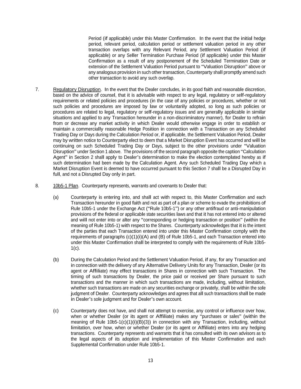 13 Period (if applicable) under this Master Confirmation. In the event that the initial hedge period, relevant period, calculation period or settlement valuation period in any other transaction overlaps with any Relevant Period, any Settlement Valuation Period (if applicable) or any Seller Termination Purchase Period (if applicable) under this Master Confirmation as a result of any postponement of the Scheduled Termination Date or extension of the Settlement Valuation Period pursuant to “Valuation Disruption” above or any analogous provision in such other transaction, Counterparty shall promptly amend such other transaction to avoid any such overlap. 7. Regulatory Disruption. In the event that the Dealer concludes, in its good faith and reasonable discretion, based on the advice of counsel, that it is advisable with respect to any legal, regulatory or self-regulatory requirements or related policies and procedures (in the case of any policies or procedures, whether or not such policies and procedures are imposed by law or voluntarily adopted, so long as such policies or procedures are related to legal, regulatory or self-regulatory issues and are generally applicable in similar situations and applied to any Transaction hereunder in a non-discriminatory manner), for Dealer to refrain from or decrease any market activity in which Dealer would otherwise engage in order to establish or maintain a commercially reasonable Hedge Position in connection with a Transaction on any Scheduled Trading Day or Days during the Calculation Period or, if applicable, the Settlement Valuation Period, Dealer may by written notice to Counterparty elect to deem that a Market Disruption Event has occurred and will be continuing on such Scheduled Trading Day or Days, subject to the other provisions under “Valuation Disruption” under Section 1 above. The provisions of the second paragraph opposite the caption “Calculation Agent” in Section 2 shall apply to Dealer’s determination to make the election contemplated hereby as if such determination had been made by the Calculation Agent. Any such Scheduled Trading Day which a Market Disruption Event is deemed to have occurred pursuant to this Section 7 shall be a Disrupted Day in full, and not a Disrupted Day only in part. 8. 10b5-1 Plan. Counterparty represents, warrants and covenants to Dealer that: (a) Counterparty is entering into, and shall act with respect to, this Master Confirmation and each Transaction hereunder in good faith and not as part of a plan or scheme to evade the prohibitions of Rule 10b5-1 under the Exchange Act (“Rule 10b5-1”) or any other antifraud or anti-manipulation provisions of the federal or applicable state securities laws and that it has not entered into or altered and will not enter into or alter any “corresponding or hedging transaction or position” (within the meaning of Rule 10b5-1) with respect to the Shares. Counterparty acknowledges that it is the intent of the parties that each Transaction entered into under this Master Confirmation comply with the requirements of paragraphs (c)(1)(i)(A) and (B) of Rule 10b5-1, and each Transaction entered into under this Master Confirmation shall be interpreted to comply with the requirements of Rule 10b5- 1(c). (b) During the Calculation Period and the Settlement Valuation Period, if any, for any Transaction and in connection with the delivery of any Alternative Delivery Units for any Transaction, Dealer (or its agent or Affiliate) may effect transactions in Shares in connection with such Transaction. The timing of such transactions by Dealer, the price paid or received per Share pursuant to such transactions and the manner in which such transactions are made, including, without limitation, whether such transactions are made on any securities exchange or privately, shall be within the sole judgment of Dealer. Counterparty acknowledges and agrees that all such transactions shall be made in Dealer’s sole judgment and for Dealer’s own account. (c) Counterparty does not have, and shall not attempt to exercise, any control or influence over how, when or whether Dealer (or its agent or Affiliate) makes any “purchases or sales” (within the meaning of Rule 10b5-1(c)(1)(i)(B)(3)) in connection with any Transaction, including, without limitation, over how, when or whether Dealer (or its agent or Affiliate) enters into any hedging transactions. Counterparty represents and warrants that it has consulted with its own advisors as to the legal aspects of its adoption and implementation of this Master Confirmation and each Supplemental Confirmation under Rule 10b5-1.