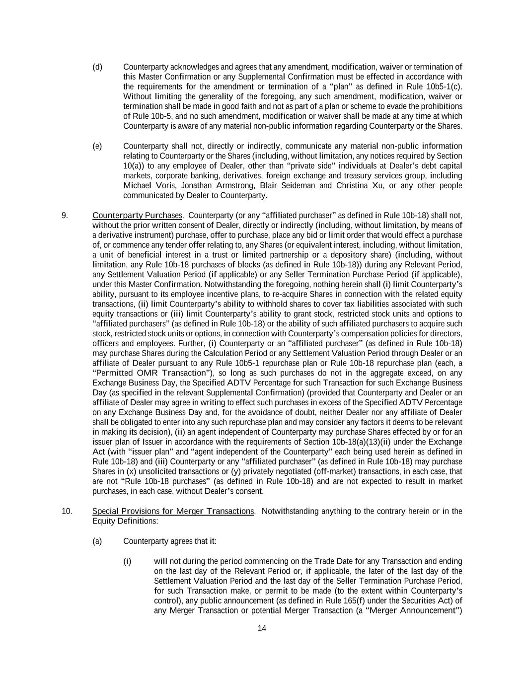 14 (d) Counterparty acknowledges and agrees that any amendment, modification, waiver or termination of this Master Confirmation or any Supplemental Confirmation must be effected in accordance with the requirements for the amendment or termination of a “plan” as defined in Rule 10b5-1(c). Without limiting the generality of the foregoing, any such amendment, modification, waiver or termination shall be made in good faith and not as part of a plan or scheme to evade the prohibitions of Rule 10b-5, and no such amendment, modification or waiver shall be made at any time at which Counterparty is aware of any material non-public information regarding Counterparty or the Shares. (e) Counterparty shall not, directly or indirectly, communicate any material non-public information relating to Counterparty or the Shares (including, without limitation, any notices required by Section 10(a)) to any employee of Dealer, other than “private side” individuals at Dealer’s debt capital markets, corporate banking, derivatives, foreign exchange and treasury services group, including Michael Voris, Jonathan Armstrong, Blair Seideman and Christina Xu, or any other people communicated by Dealer to Counterparty. 9. Counterparty Purchases. Counterparty (or any “affiliated purchaser” as defined in Rule 10b-18) shall not, without the prior written consent of Dealer, directly or indirectly (including, without limitation, by means of a derivative instrument) purchase, offer to purchase, place any bid or limit order that would effect a purchase of, or commence any tender offer relating to, any Shares (or equivalent interest, including, without limitation, a unit of beneficial interest in a trust or limited partnership or a depository share) (including, without limitation, any Rule 10b-18 purchases of blocks (as defined in Rule 10b-18)) during any Relevant Period, any Settlement Valuation Period (if applicable) or any Seller Termination Purchase Period (if applicable), under this Master Confirmation. Notwithstanding the foregoing, nothing herein shall (i) limit Counterparty’s ability, pursuant to its employee incentive plans, to re-acquire Shares in connection with the related equity transactions, (ii) limit Counterparty’s ability to withhold shares to cover tax liabilities associated with such equity transactions or (iii) limit Counterparty’s ability to grant stock, restricted stock units and options to “affiliated purchasers” (as defined in Rule 10b-18) or the ability of such affiliated purchasers to acquire such stock, restricted stock units or options, in connection with Counterparty’s compensation policies for directors, officers and employees. Further, (i) Counterparty or an “affiliated purchaser” (as defined in Rule 10b-18) may purchase Shares during the Calculation Period or any Settlement Valuation Period through Dealer or an affiliate of Dealer pursuant to any Rule 10b5-1 repurchase plan or Rule 10b-18 repurchase plan (each, a “Permitted OMR Transaction”), so long as such purchases do not in the aggregate exceed, on any Exchange Business Day, the Specified ADTV Percentage for such Transaction for such Exchange Business Day (as specified in the relevant Supplemental Confirmation) (provided that Counterparty and Dealer or an affiliate of Dealer may agree in writing to effect such purchases in excess of the Specified ADTV Percentage on any Exchange Business Day and, for the avoidance of doubt, neither Dealer nor any affiliate of Dealer shall be obligated to enter into any such repurchase plan and may consider any factors it deems to be relevant in making its decision), (ii) an agent independent of Counterparty may purchase Shares effected by or for an issuer plan of Issuer in accordance with the requirements of Section 10b-18(a)(13)(ii) under the Exchange Act (with “issuer plan” and “agent independent of the Counterparty” each being used herein as defined in Rule 10b-18) and (iii) Counterparty or any “affiliated purchaser” (as defined in Rule 10b-18) may purchase Shares in (x) unsolicited transactions or (y) privately negotiated (off-market) transactions, in each case, that are not “Rule 10b-18 purchases” (as defined in Rule 10b-18) and are not expected to result in market purchases, in each case, without Dealer’s consent. 10. Special Provisions for Merger Transactions. Notwithstanding anything to the contrary herein or in the Equity Definitions: (a) Counterparty agrees that it: (i) will not during the period commencing on the Trade Date for any Transaction and ending on the last day of the Relevant Period or, if applicable, the later of the last day of the Settlement Valuation Period and the last day of the Seller Termination Purchase Period, for such Transaction make, or permit to be made (to the extent within Counterparty’s control), any public announcement (as defined in Rule 165(f) under the Securities Act) of any Merger Transaction or potential Merger Transaction (a “Merger Announcement”)